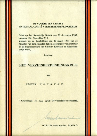 In 1982 ontving Marten Toonder voor zijn bijdrage aan het verzet het Verzetsherdenkingskruis.