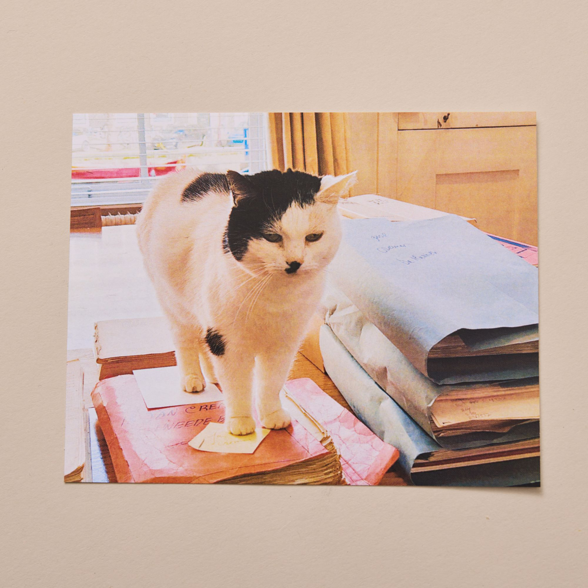 Al het materiaal was keurig opgeborgen in het huis aan de Keizersgracht en het was een stevige klus om alles naar het depot van het museum te transporteren. Daar ligt het nu veilig, al werd het ook in Amsterdam goed bewaakt: hier zien we de Cremer-huiskat op het typoscript van Ik Jan Cremer. Tweede boek.