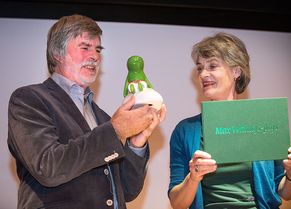 Wim Hofman ontvangt de Max Velthuijs-prijs in het Literatuurmuseum in Den Haag. Foto: Mylène Siegers.