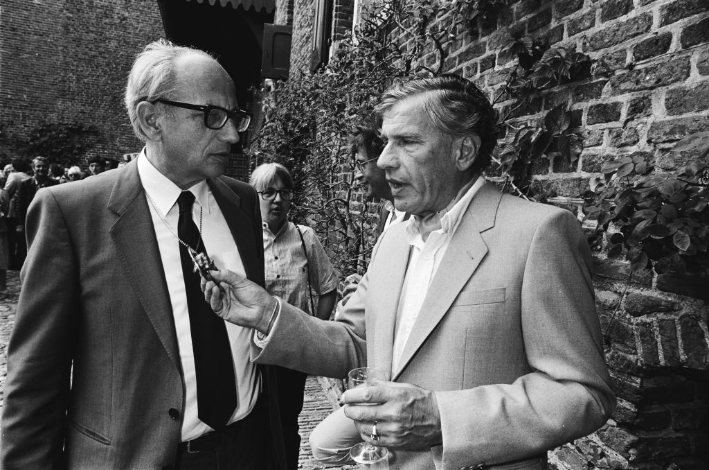 Prof. Karel van het Reve ontvangt P.C. Hooft-prijs op Muiderslot; Karel van het Reve (links met bril) in gesprek met zijn broer Gerard Reve op binnenplein van Muiderslot. Foto: Rob C. Croes / Nationaal Archief.