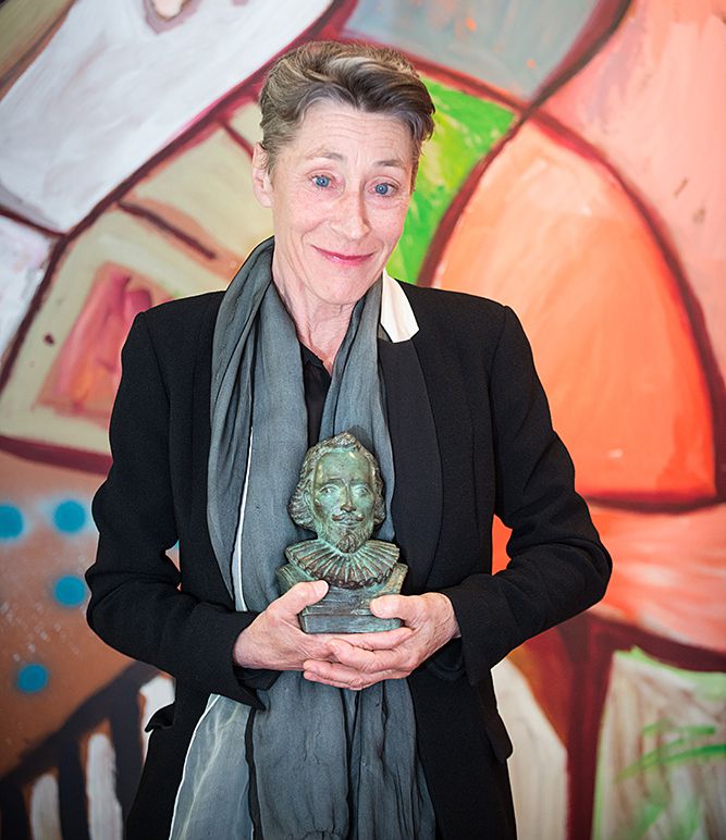 Anneke Brassinga met het beeldje van de P.C. Hooft-prijs in het Literatuurmuseum te Den Haag. Foto: Mylène Siegers.