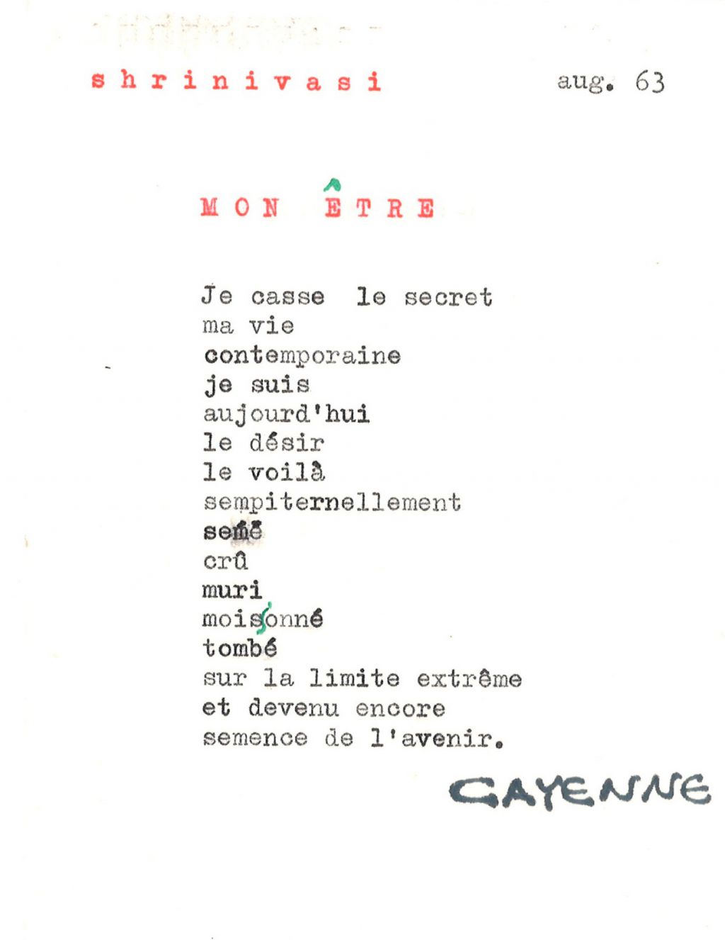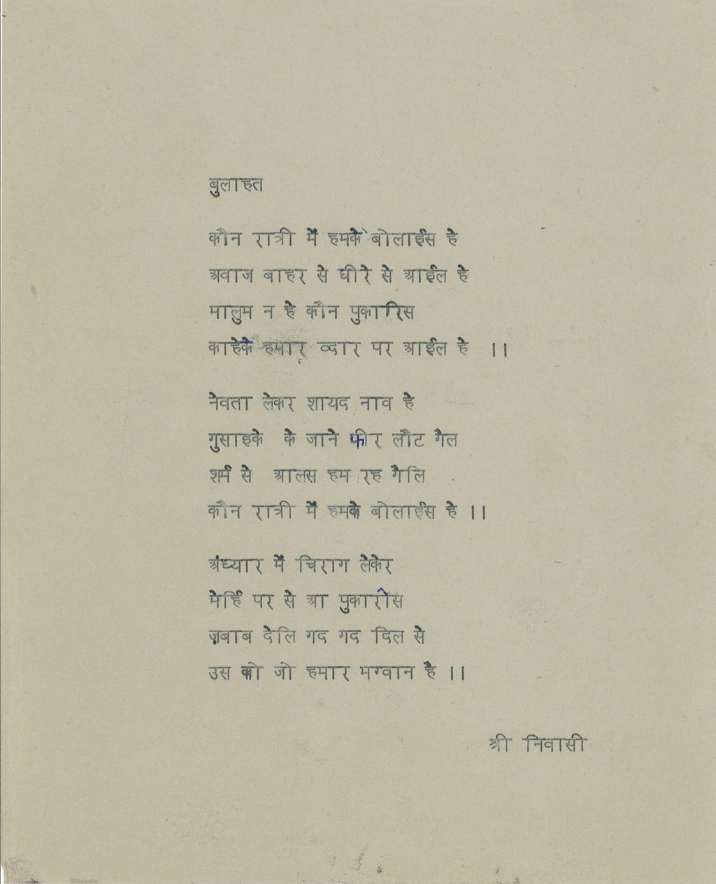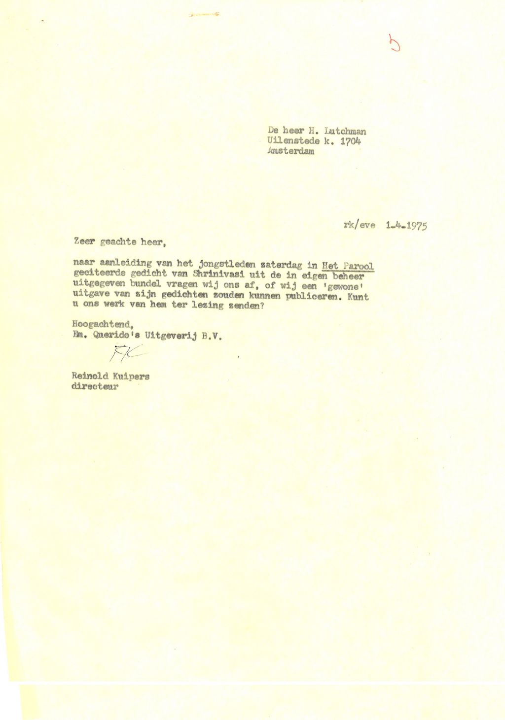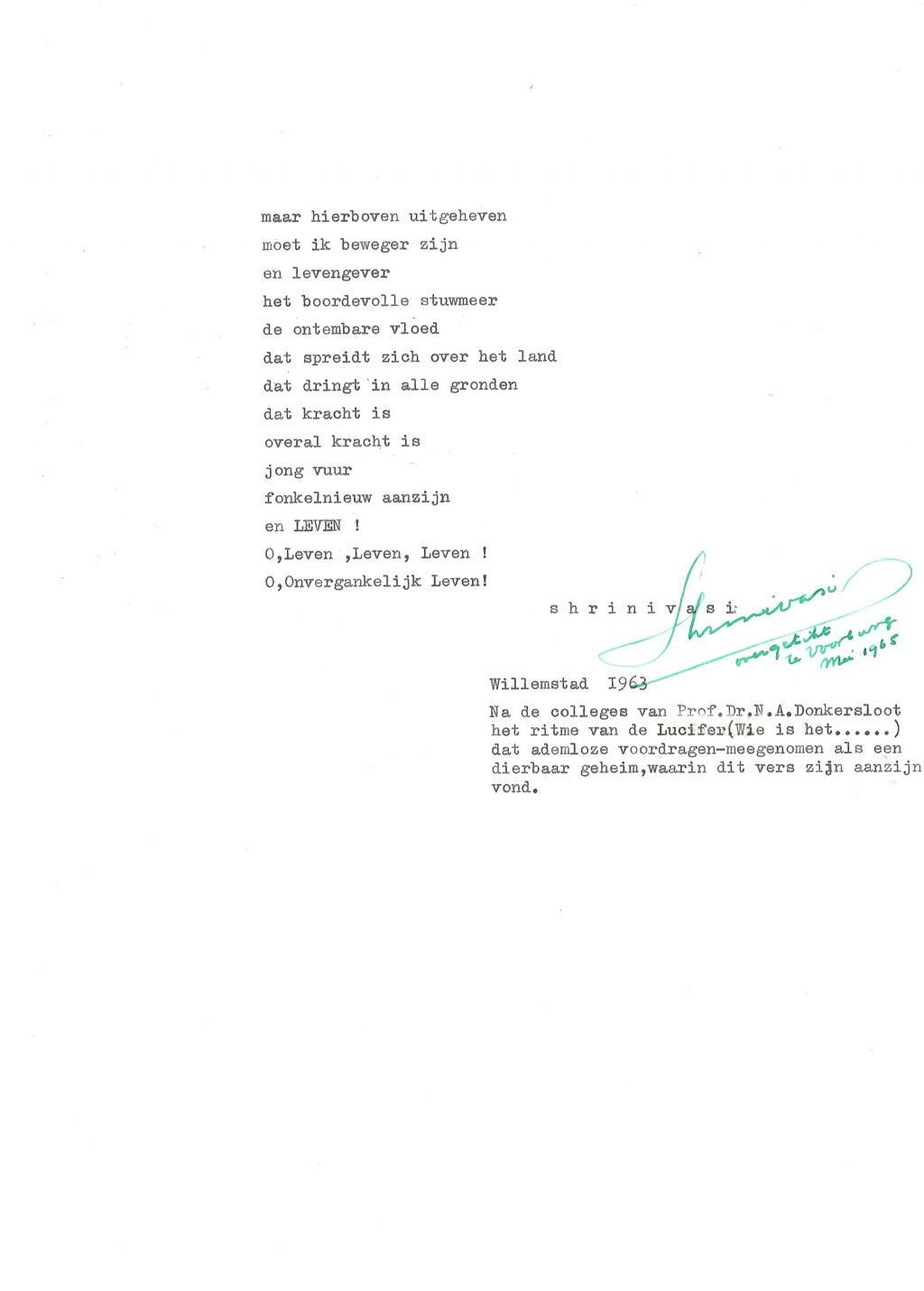 Hij publiceerde zijn dichtbundels in Paramaribo, bij plaatselijke uitgeverijen als Eldorado en Bureau Volkscultuur, volgens Geert Koefoed, die de bloemlezing had ingeleid, kwam dat neer op verkapt eigen beheer. Maar bewonderaars in Nederland had hij altijd gehad. N.A. Donkersloot bijvoorbeeld, van wie Shrinivāsi college had gevolgd – wat hem inspireerde tot het gedicht ‘Afobakadam’: ‘dat ademloze voordragen – meegenomen als een dierbaar geheim, waarin dit vers zijn aanzijn vond.’
