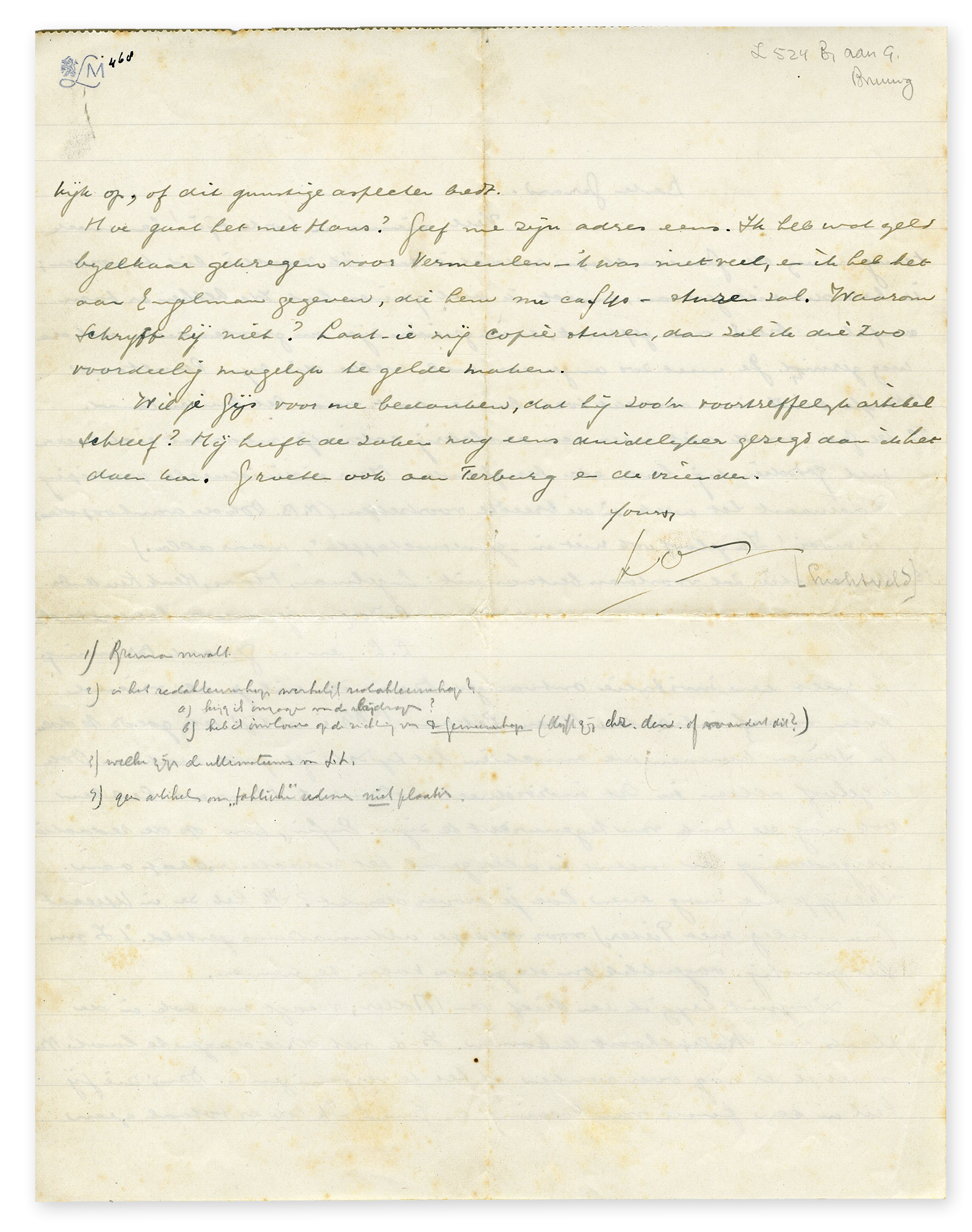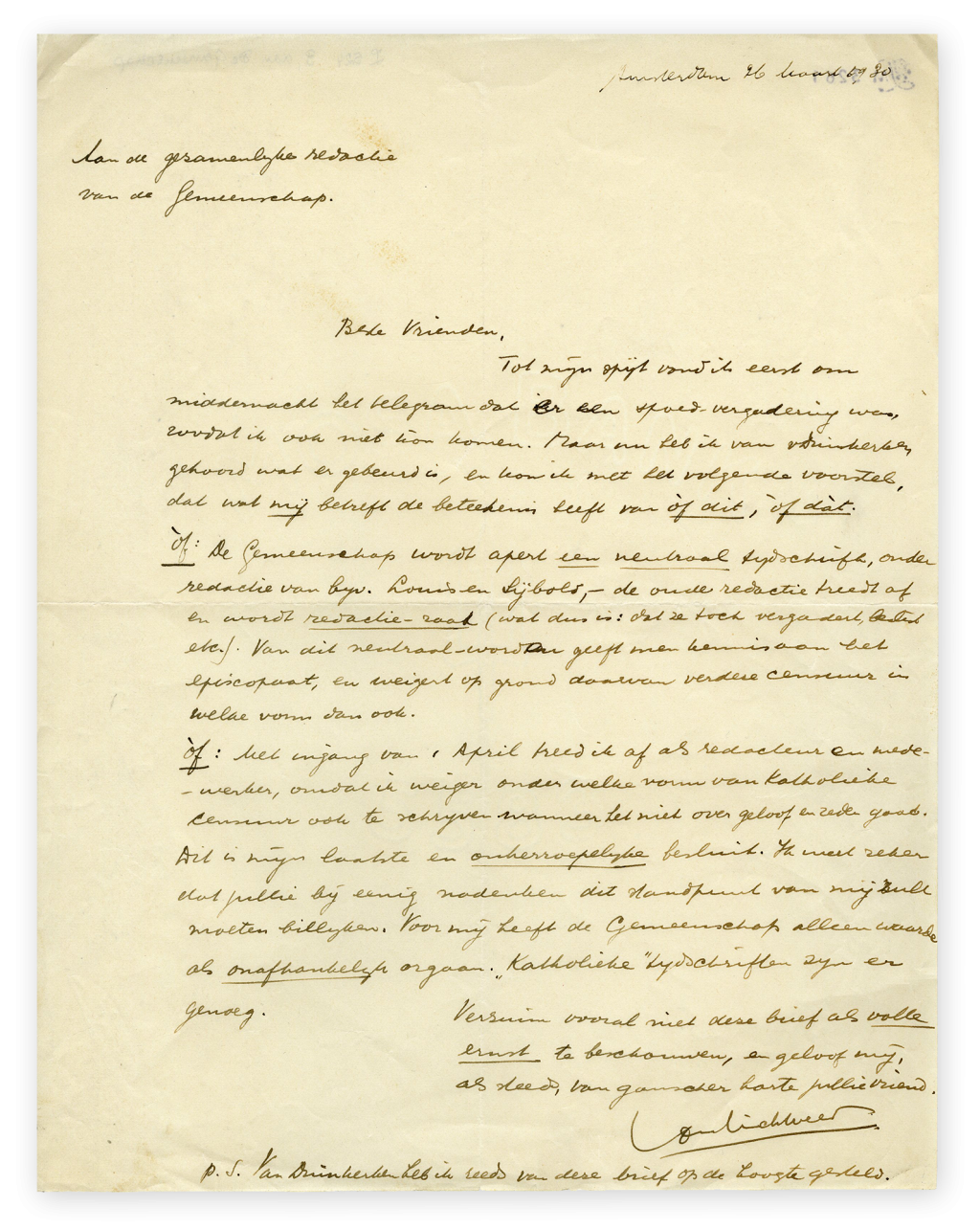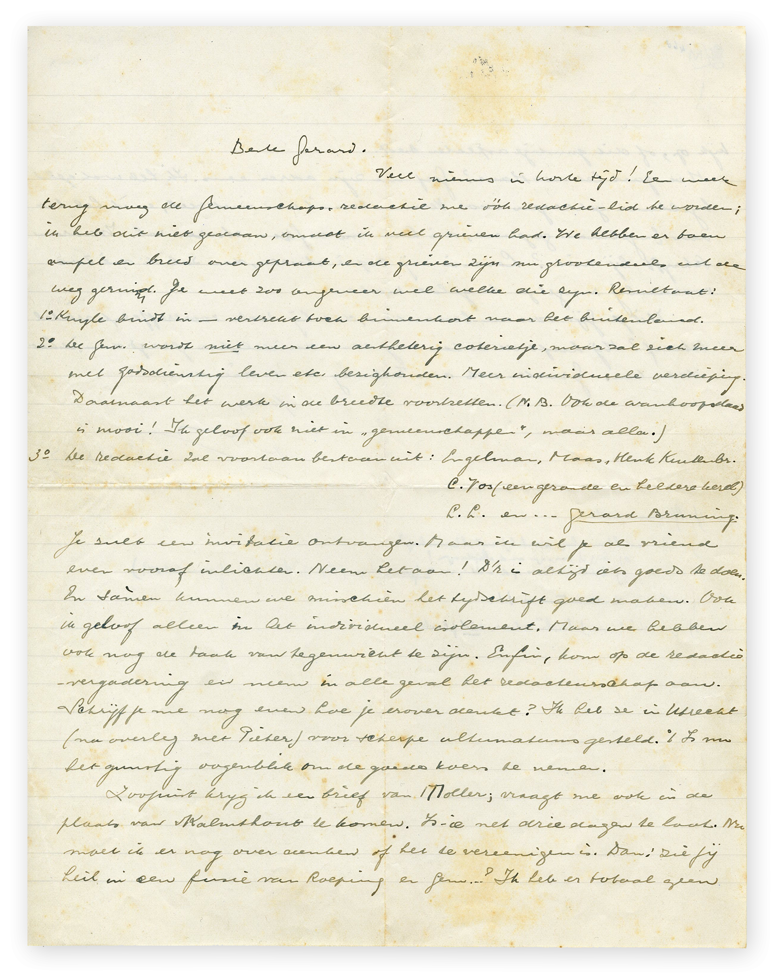‘Neem het aan!’ schreef Lichtveld hem. Hijzelf had dat inmiddels gedaan, maar niet zonder onderhandelingen, zoals ook wel te verwachten was van Lichtveld, die goed wist wat hij wel en niet wilde en heel zijn lange leven eigenwijs bleef. ‘De Gem.[eenschap] wordt niet meer een aestheterig coterietje, maar zal zich meer met godsdienstig leven etc. bezighouden. Meer individueele verdieping. Daarnaast het werk in de breedte voortzetten. (N.B. Ook de wanhoopsdaad is mooi! Ik geloof ook niet in “gemeenschappen”, maar alla.)’ Maar Bruning had er weinig vertrouwen in: ‘Is het redakteurschap werkelijk redakteurschap?’ is een van de opmerkingen die hij op Lichtvelds brief noteerde. Hij deed het niet. Droevig genoeg begon binnen een jaar het tiende nummer van de tweede jaargang met een in memoriam over Bruning.
