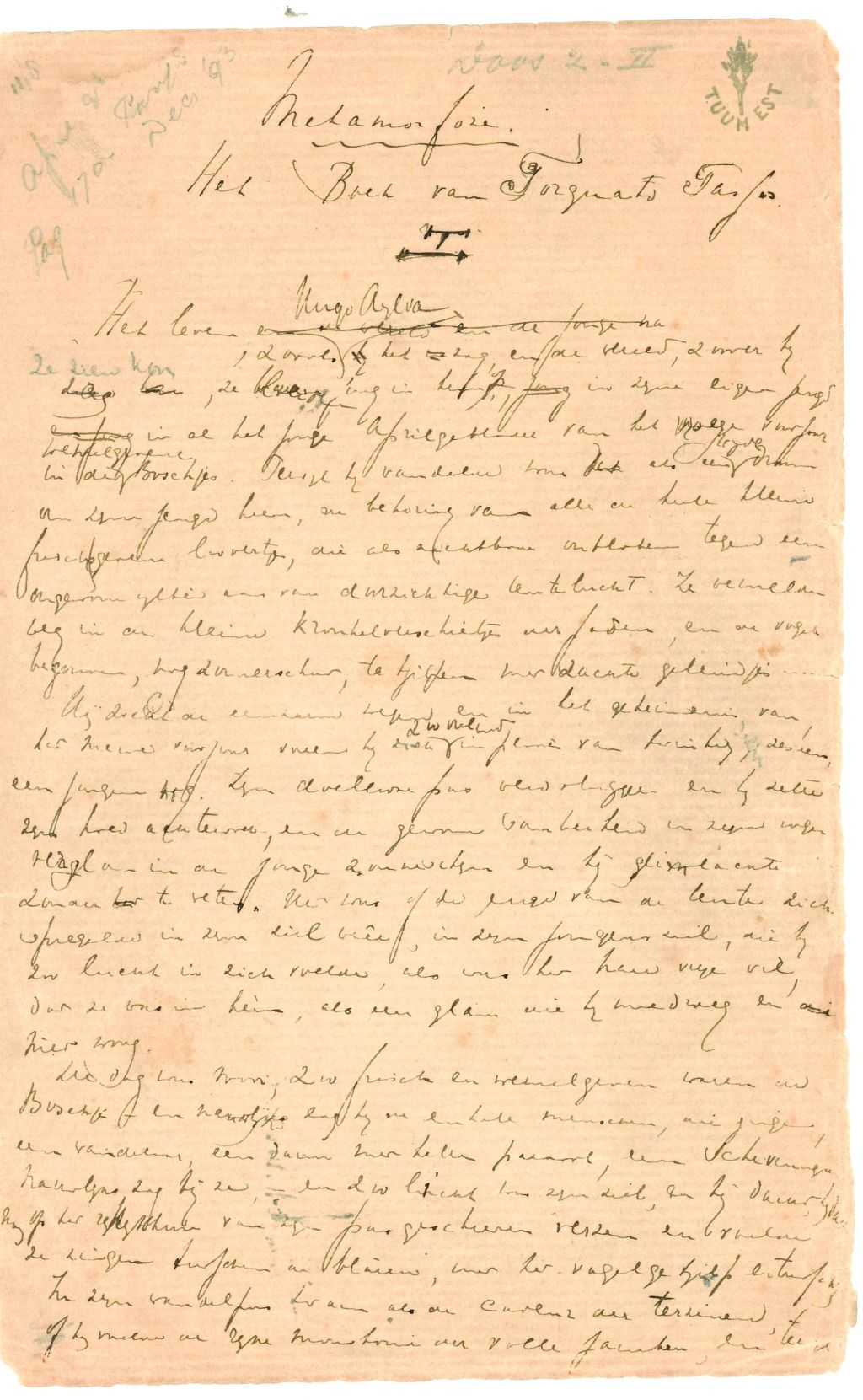 Couperus achter zijn schrijftafel, het is een foto waar je lang naar kunt kijken. Het is natuurlijk een geënsceneerde situatie, de quasi-verrast opkijkende Couperus met de pen in de hand, maar het is wel zijn bureau, met het portret van zijn moeder door J.C. Valois en zijn schemerlamp die nu op de gang van de kantoren van het Literatuurmuseum is te vinden. De foto werd gemaakt in zijn huis 't Sunneke in De Steeg, waar Couperus de laatste maanden van zijn leven zou verblijven.