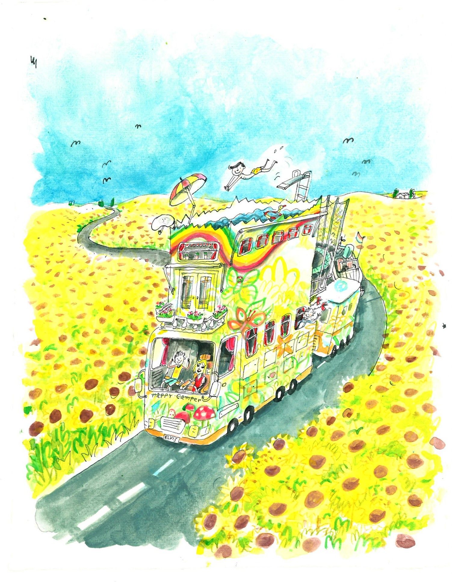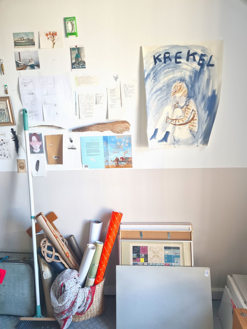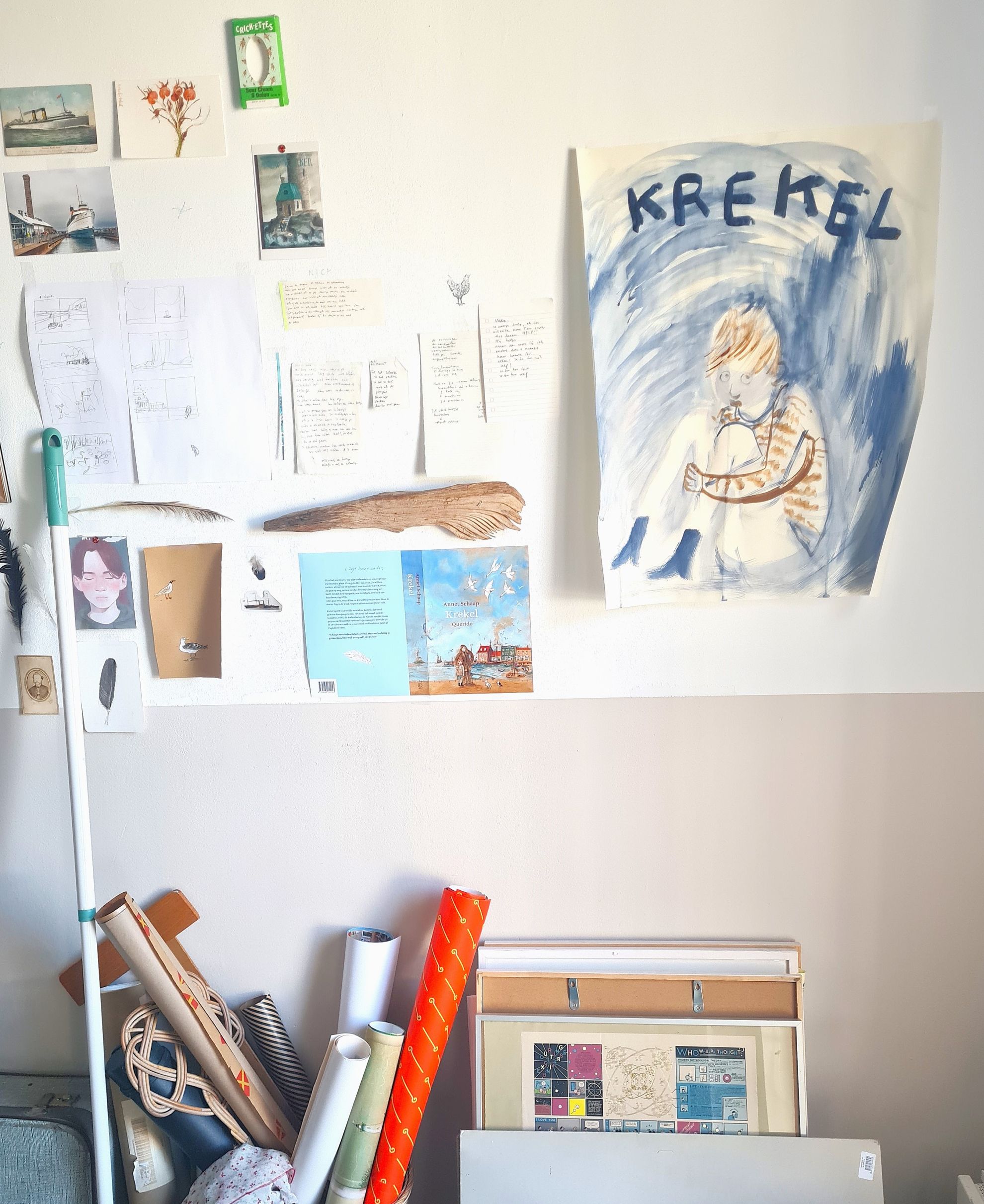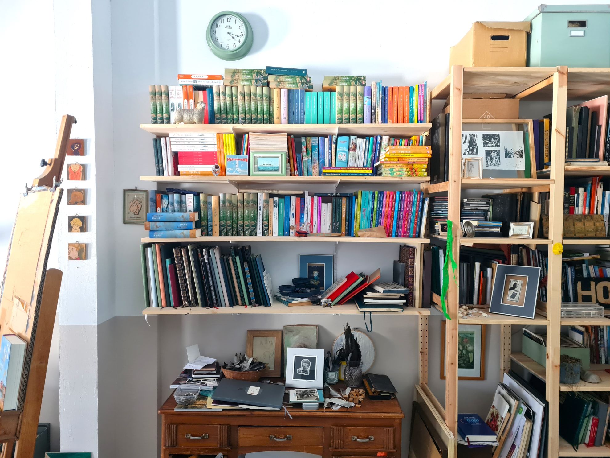 Maar binnen heeft het alles wat een schatkamer voor verhalenliefhebbers moet hebben. Zoals tientallen grote, licht vergeelde schrijfboeken waarin de basis van Schaaps jeugdromans werd opgeschreven. (Zeven boeken voor Lampje en tweeëndertig (!) voor Krekel.) Aan de muur veel grote en kleine lijstjes met daarin getekende schetsjes, flinke schilderijen, foto’s, grapjes. Een schildersezel. In het midden van de kamer een robuuste, verweerde tafel waaraan geschreven, geïllustreerd, gedicht en gerepeteerd kan worden. Want dat alles doet Schaap: ze illustreerde meer dan tweehonderd boeken, waaronder de Hoe overleef ik-serie van Francine Oomen en de door Jacques Vriens geschreven verhalen over Meester Jaap.