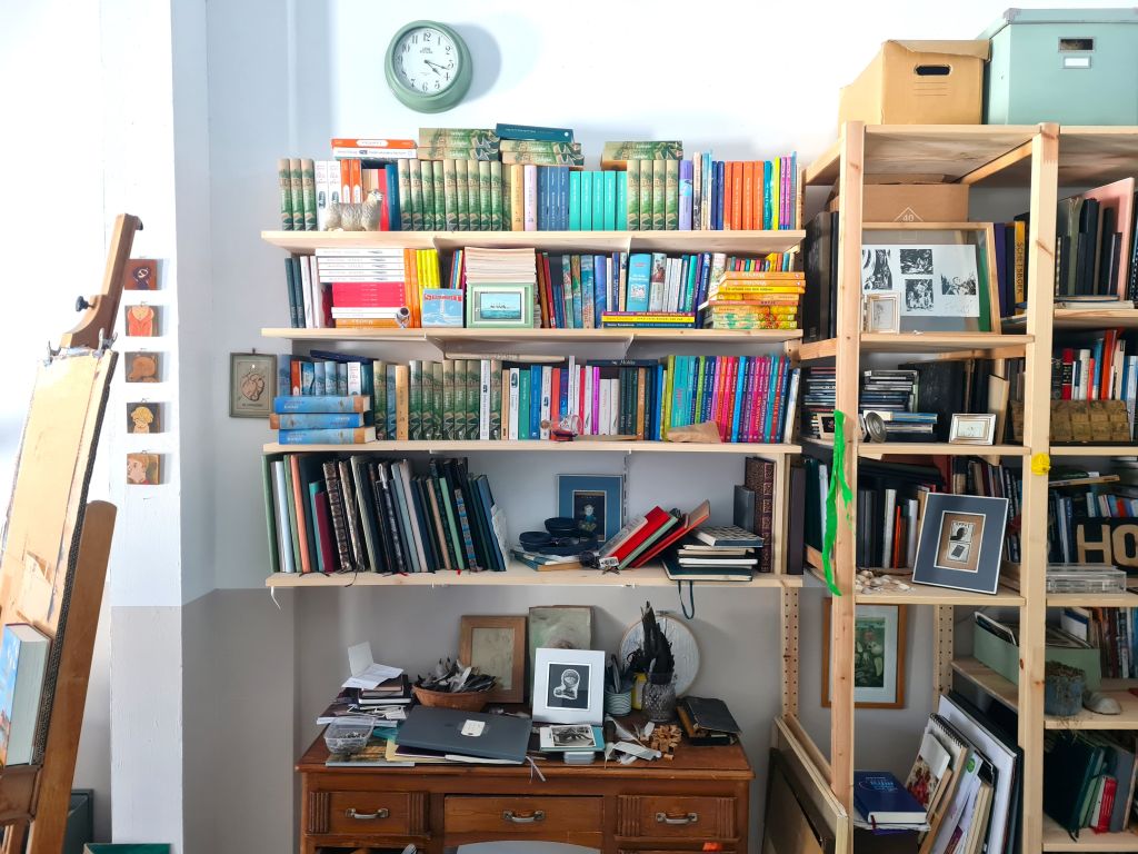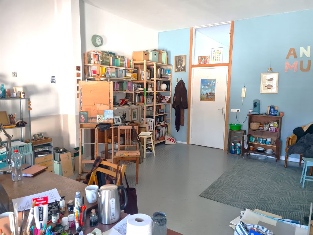 Vol verwachting en bewondering zet ik zo mijn eerste voorzichtige stappen in het atelier van schrijver en illustrator Annet Schaap. Haar werkplek, waar zij bijna elke middag werkzaam is, ligt aan de rand van het centrum van Utrecht. Eromheen lopend is er weinig bijzonders aan het gebouw op te merken. Het is een groot pand met allerlei kantoortjes aan een druk straatje, tegenover een gevangenis, naast een parkeergarage. Een van de kantoortjes is van haar.