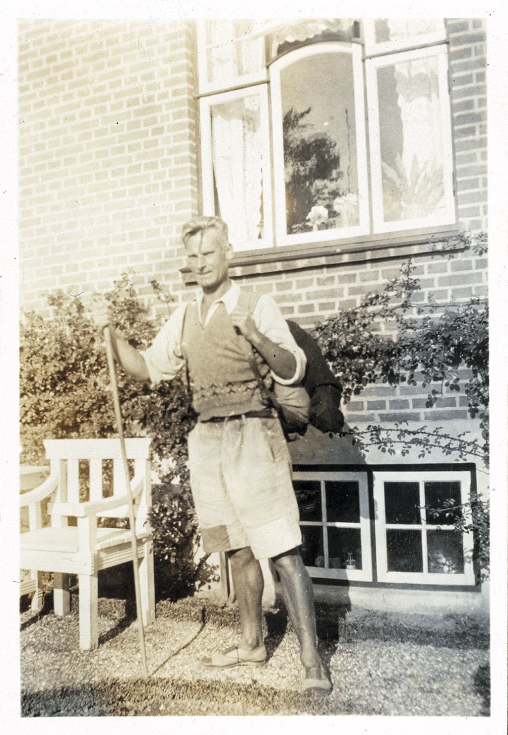 Een foto van de schrijver Belcampo voor een huis in Nederland. Waar precies, dat weet ik niet. Belcampo heeft een stuurse blik. Hij draagt een hemd waarvan de mouwen zijn opgerold, daaroverheen heeft hij een keurig gilletje aangetrokken. Onder zijn korte broek komen stevige kuiten vandaan. Op een krachtige manier houdt de schrijver zijn wandelstok vast. In zijn boek De zwerftocht van Belcampo schrijft hij specifiek over zijn eigen weloverwogen uitrusting: ‘Ik zag eruit als een soort herenlandloper, zodat arm en rijk zich met mij op hun gemak konden voelen.’