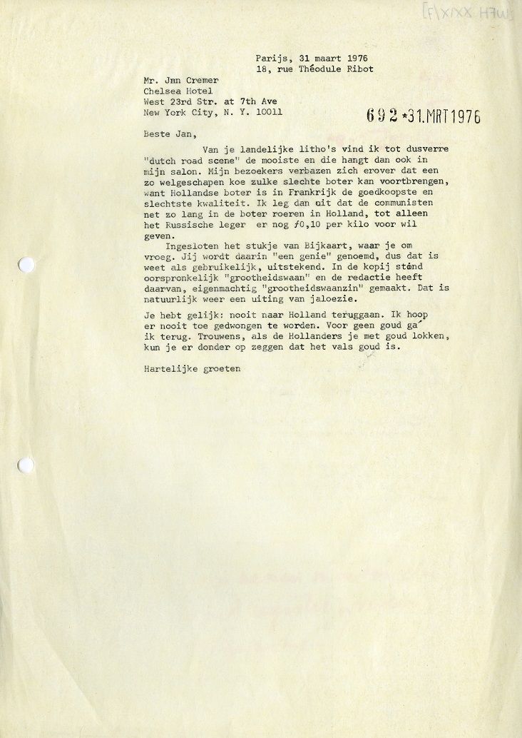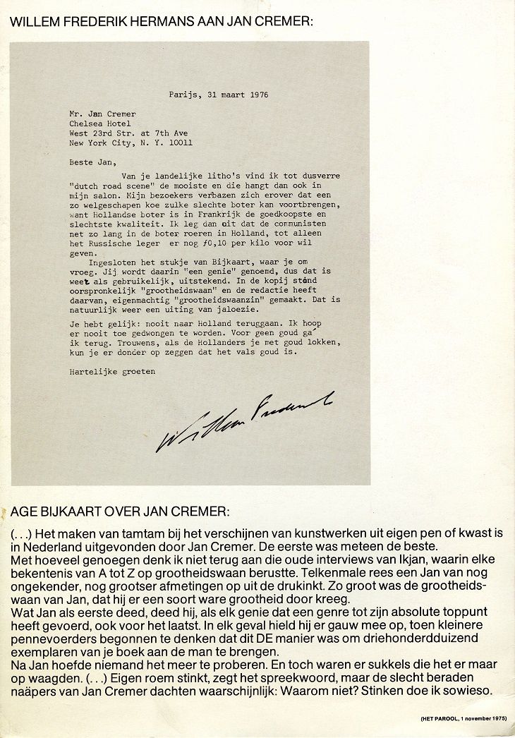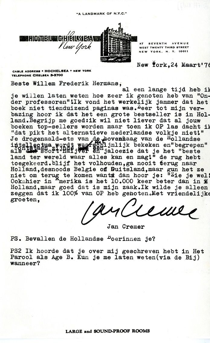 Er was, blijkt ook uit een parel van een correspondentie, sprake van wederzijdse waardering. In 1962 al las Hermans voorpublicaties van Ik Jan Cremer en attendeerde zijn uitgever Geert Lubberhuizen (De Bezige Bij) erop. Het boek, dat in 1964 verscheen en een bestseller werd, heeft als middelste motto een citaat uit De donkere kamer van Damokles: ‘Wat is een held? Iemand die straffeloos onvoorzichtig is geweest.’ Hermans was lovend. ‘Ik Jan Cremer,’ schreef hij in Cremers cadeauexemplaar van zijn eigen vers verschenen Mandarijnen op zwavelzuur (ook 1964), ‘is het eerste boek sinds onheugelijke tijden dat ik binnen 24 uur heb uitgelezen’, zo is te lezen in Jan Cremer in beeld.