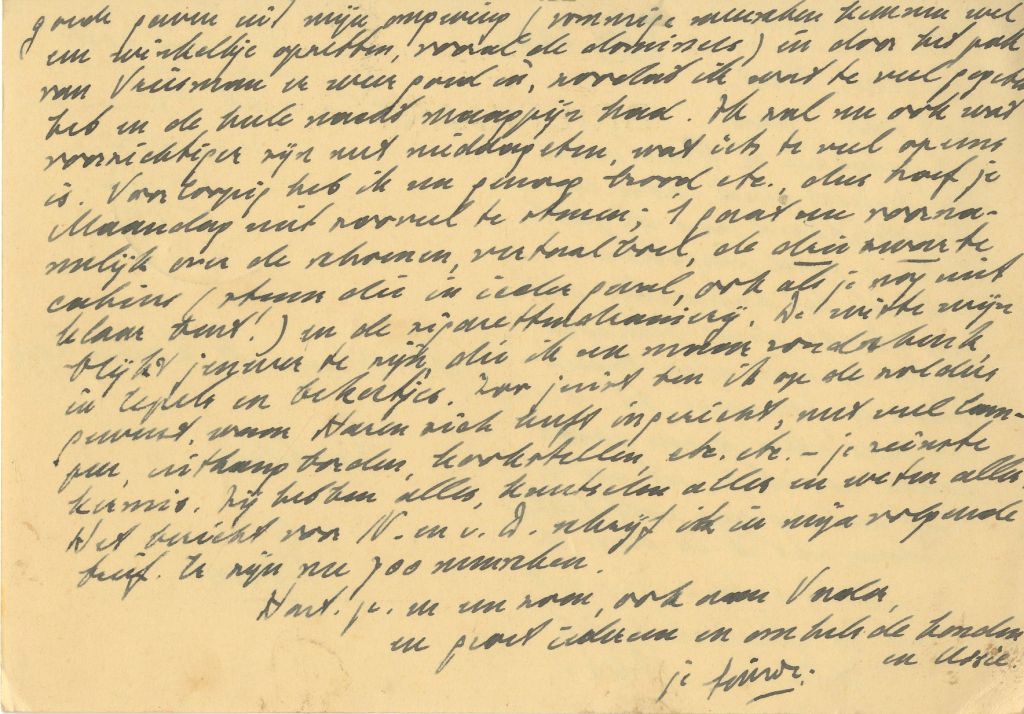 Laat ik je citaat van Dèr Mouw terugkaatsen: ‘Ik vroeg je, hoe ’t met joù ging, met ’t werken, drinken, vrijen, plassen. Waarom antwoord je daar niet eens op?’ Zo letterlijk vroeg ik je dit allemaal niet, maar ik blijf wel benieuwd naar wat de afzondering met je doet. Het klinkt alsof je leven zijn gang gaat, niet beter is dan eerst maar ook niet veel minder. Klopt dat? Ik waardeer dat je je niet te veel laat meevoeren door je gedachtes en emoties, zoals ik deze dagen meer doe.