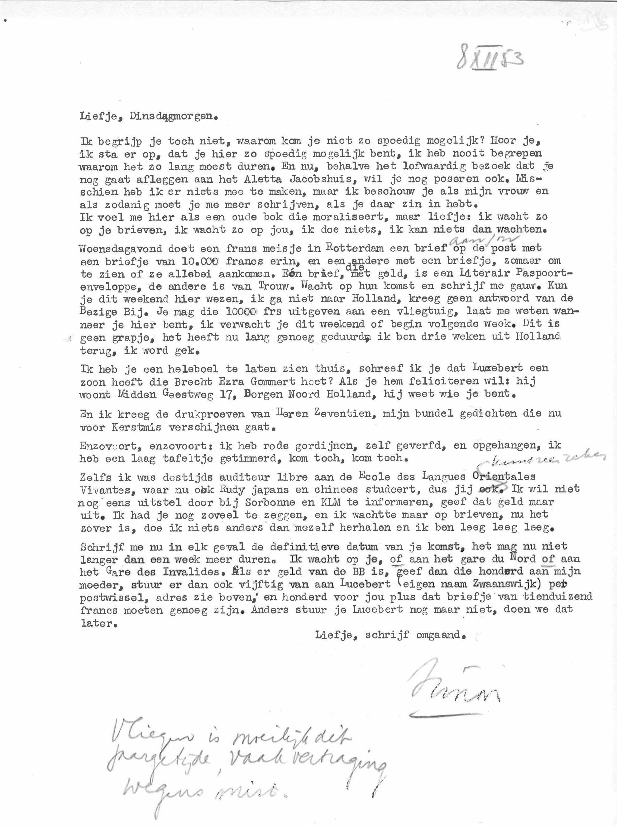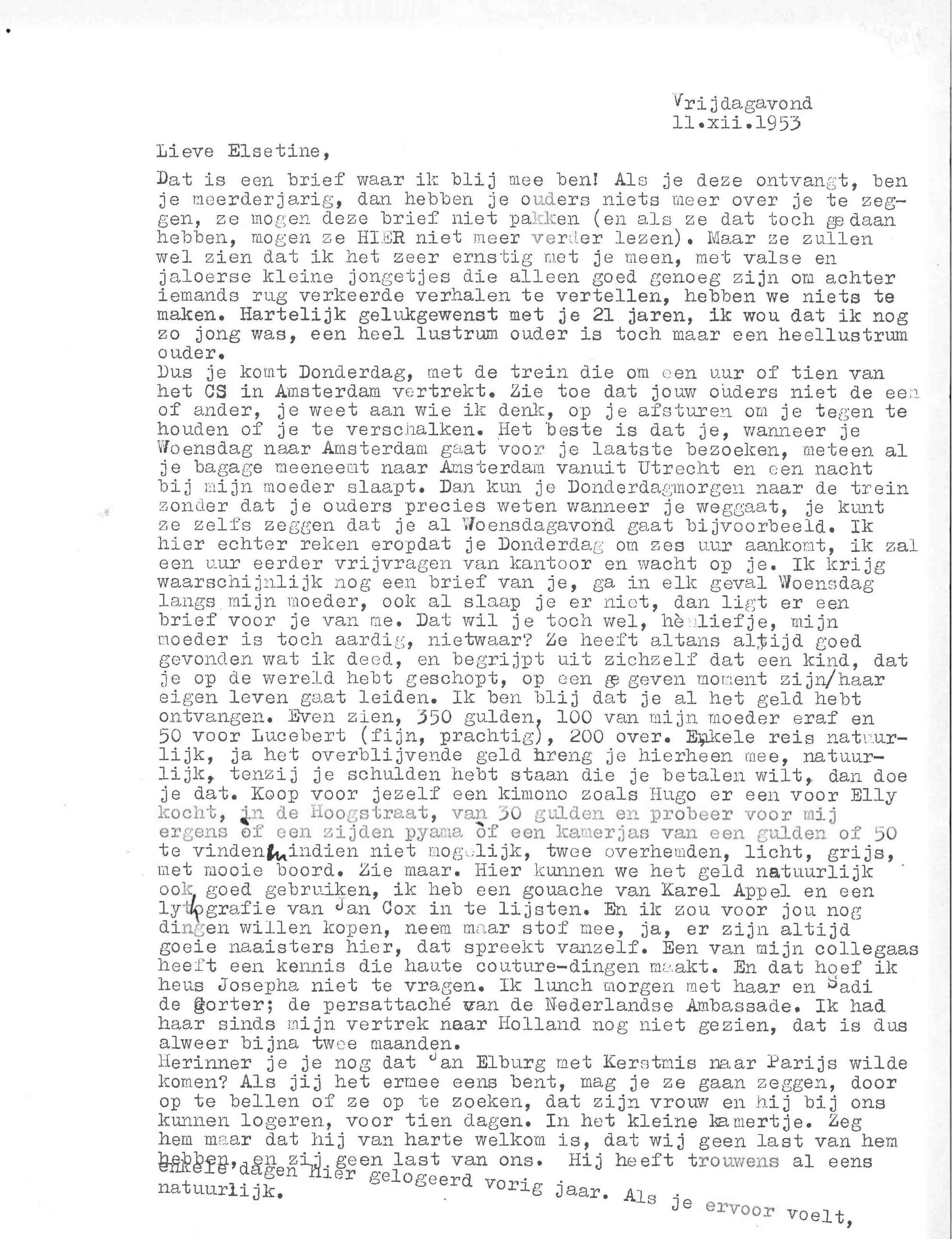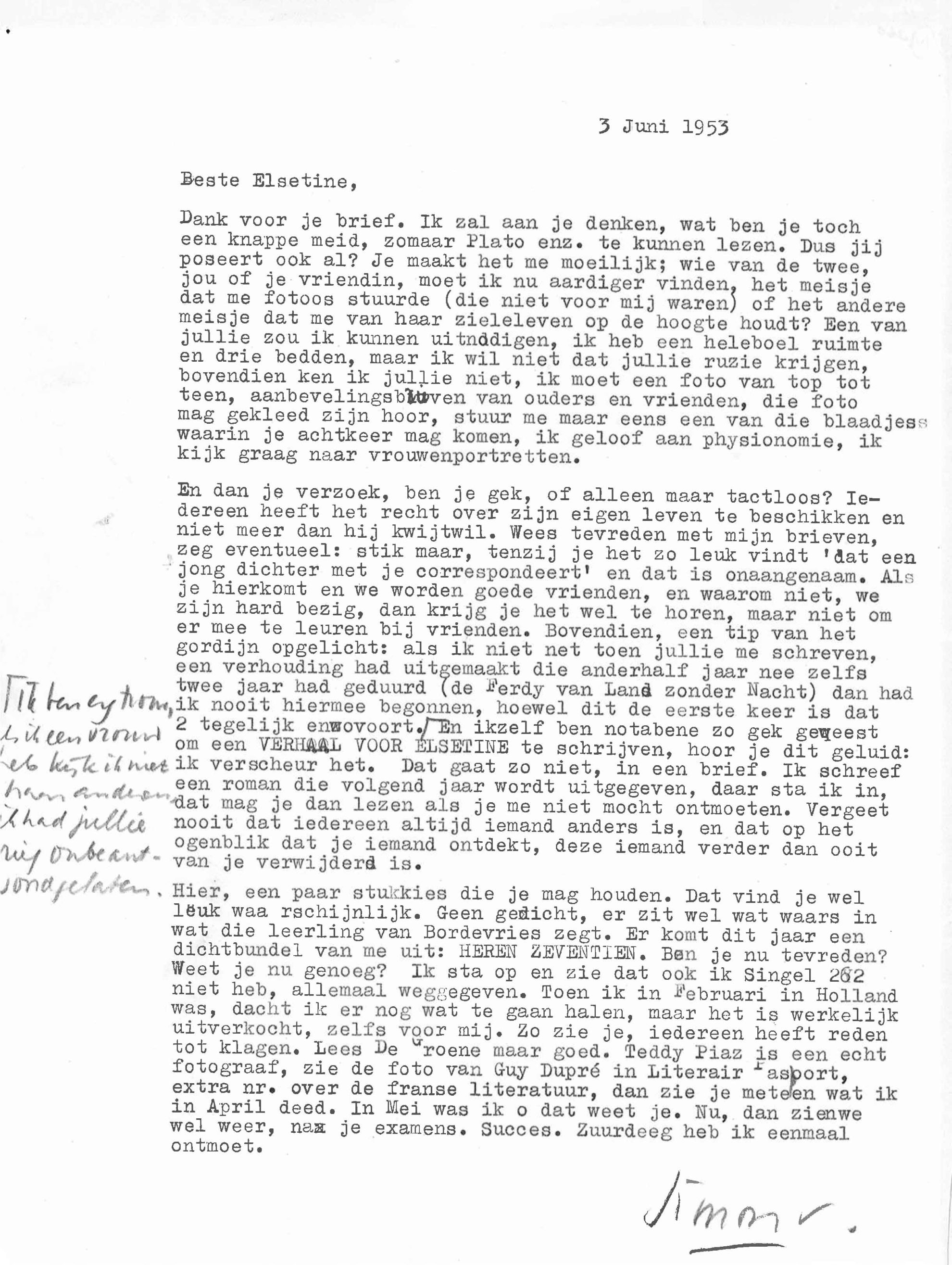Het is 1953 als Simon Vinkenoog in Parijs verblijft (de stad waar hij in 1948 is neergestreken: ‘In Amsterdam gebeurde gewoon niets’), waar hij zijn werkzaamheden voor Unesco combineert met schrijven. Hij schrijft gedichten, een prille roman, maar toont zich vooral productief als brievenschrijver. Zijn contacten bevinden zich op afstand en Vinkenoog vereenzaamt. Dan ontvangt hij een brief, afkomstig van de Nederlandse Elsetine den Daas, twintig jaar oud, waarin zij hem vraagt om bemiddeling: ze wil ook naar Parijs. Ze sluit twee foto’s bij waar Vinkenoog direct van gecharmeerd is: ‘Waarom u juist mij moest uitzoeken is mij natuurlijk een raadsel, er zijn officiele adressen hier te Parijs die hun bemiddeling verlenen (...). Ik begrijp het echter: U wilde twee fotoos kwijt van een zeer aantrekkelijke jongedame en inderdaad, ik houd ze voorlopig hier. Om te bezien. Dagelijks.’