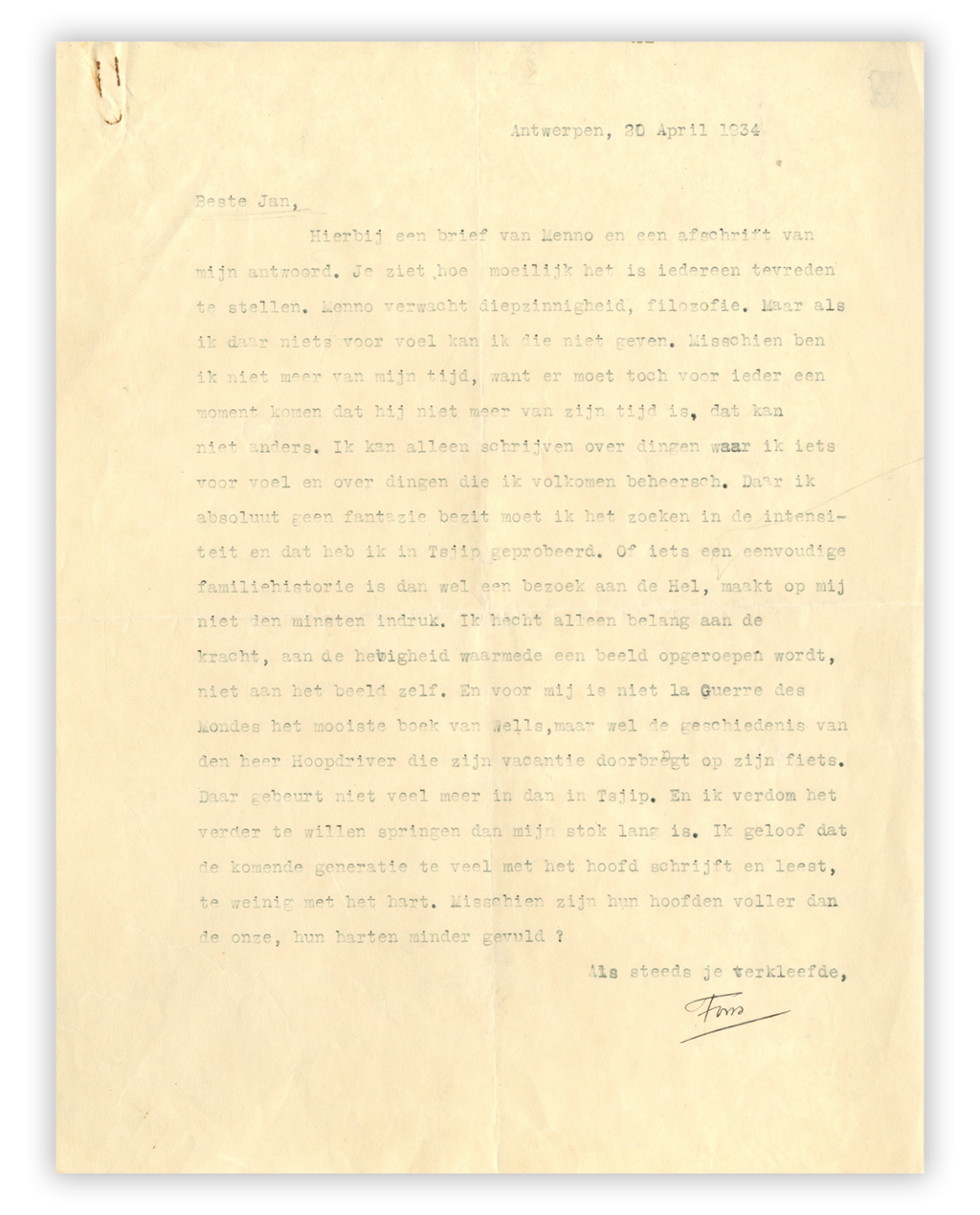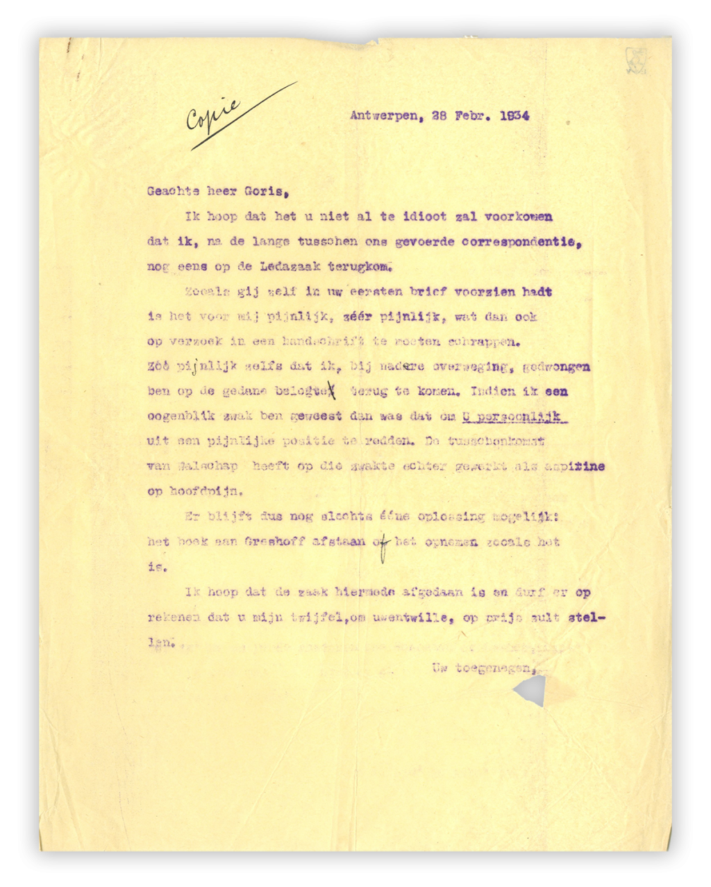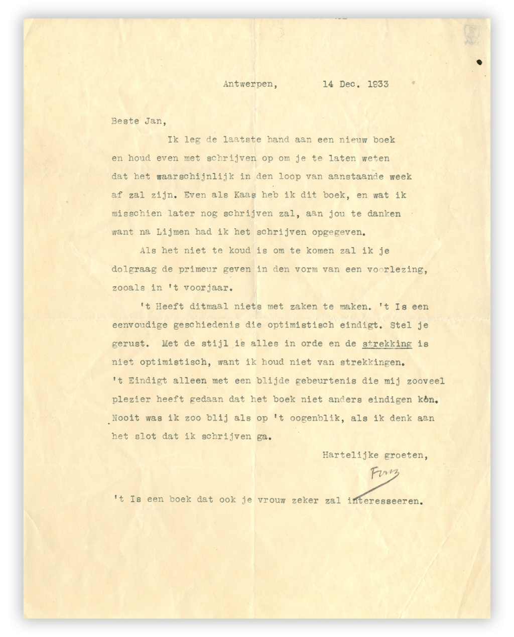 De zaken beginnen, zoals wel vaker bij Elsschot, vrolijk. De Antwerpse schrijver is verheugd dat hij zijn goede vriend Jan Greshoff (1888-1971) kan melden dat hij een nieuw boek klaar heeft, zeker omdat hij ‘na Lijmen het schrijven opgegeven had’.