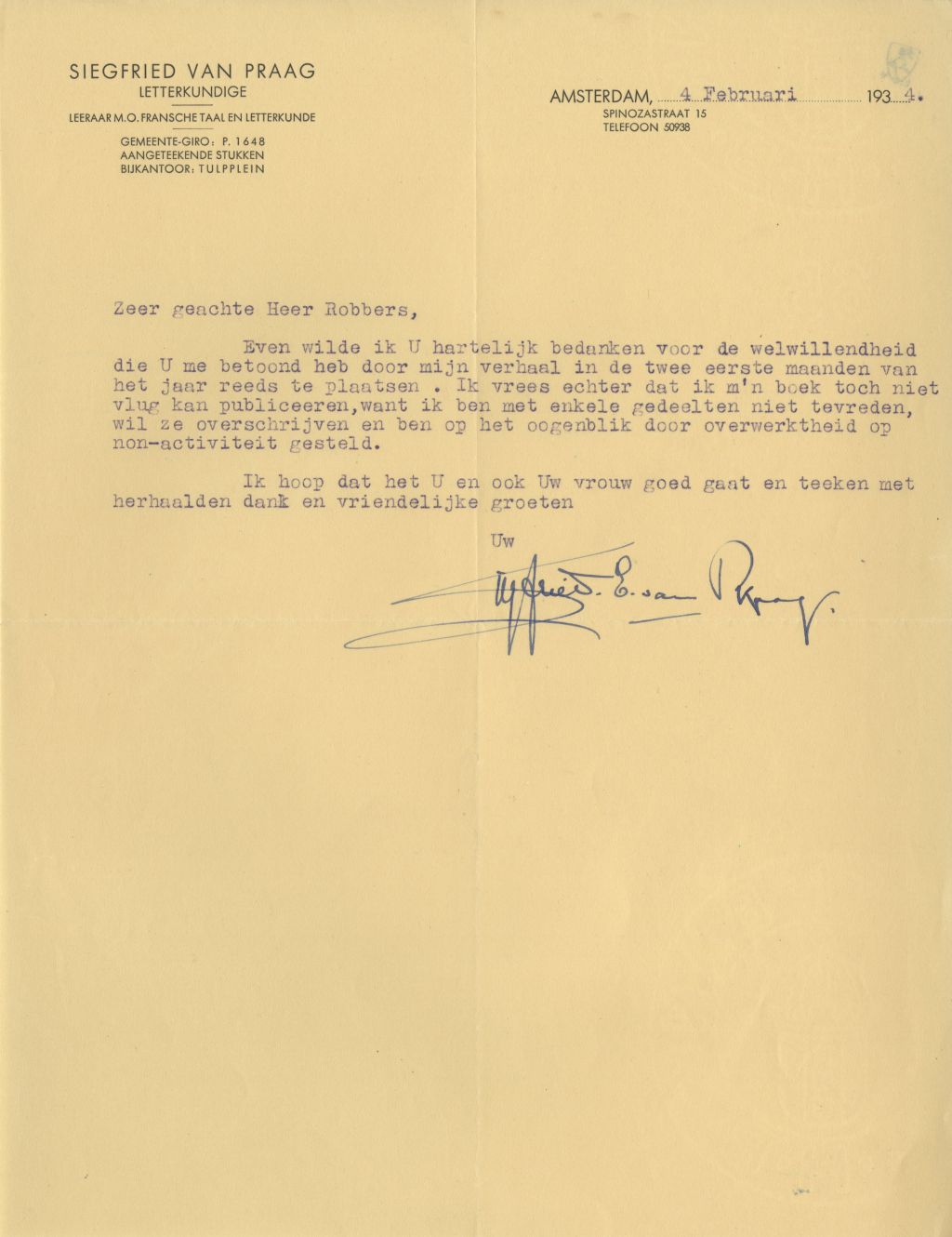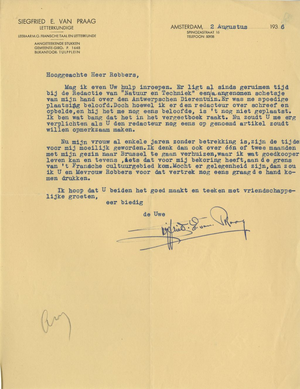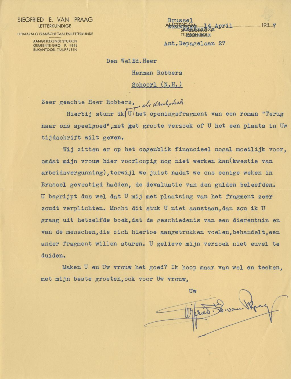 Op 2 augustus 1936 schrijft Siegfried van Praag in een brief aan Herman Robbers: