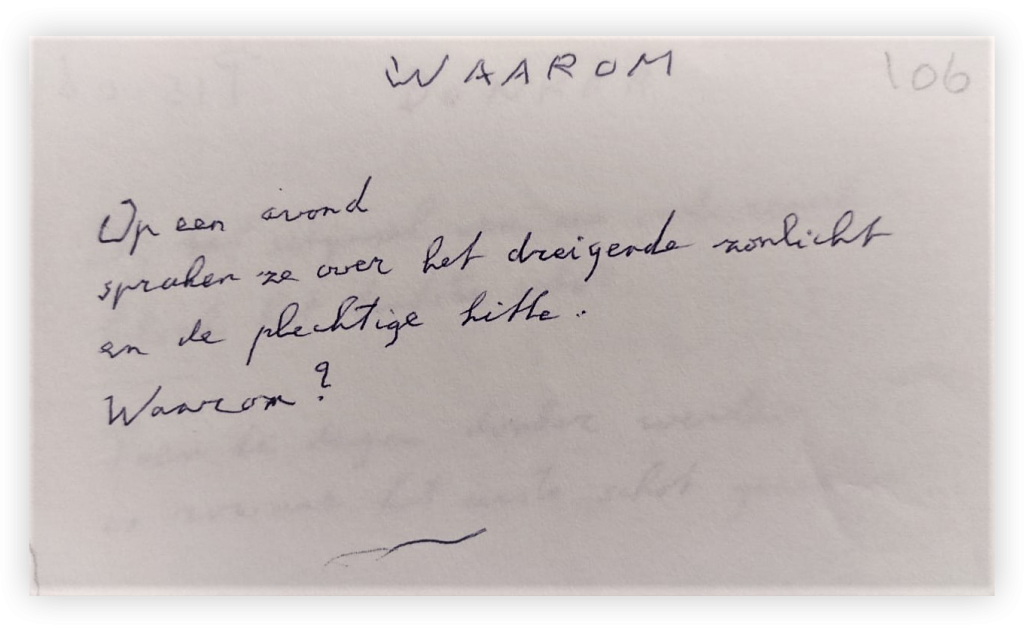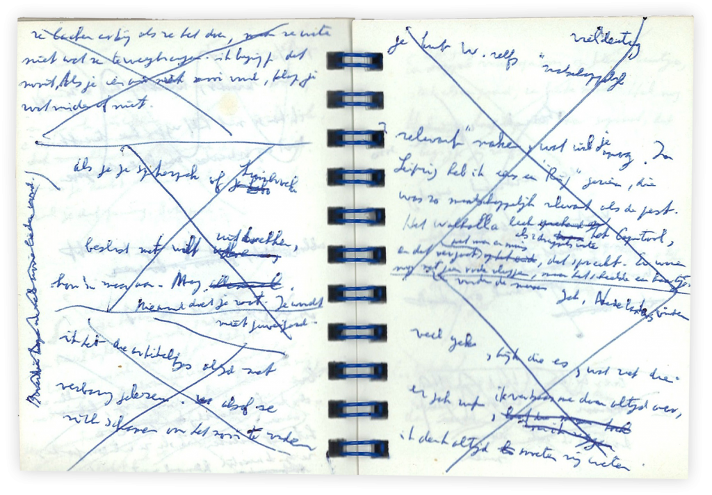 Het geldt niet alleen voor zijn beeldende werk, maar ook voor het literaire. In de gedichten staat geen woord te veel – dus die zijn vaak kort, maar de thematiek is groots en onontkoombaar. Oorlog, geweld, vernietiging, zoals in de bundel tucht uit 1979.