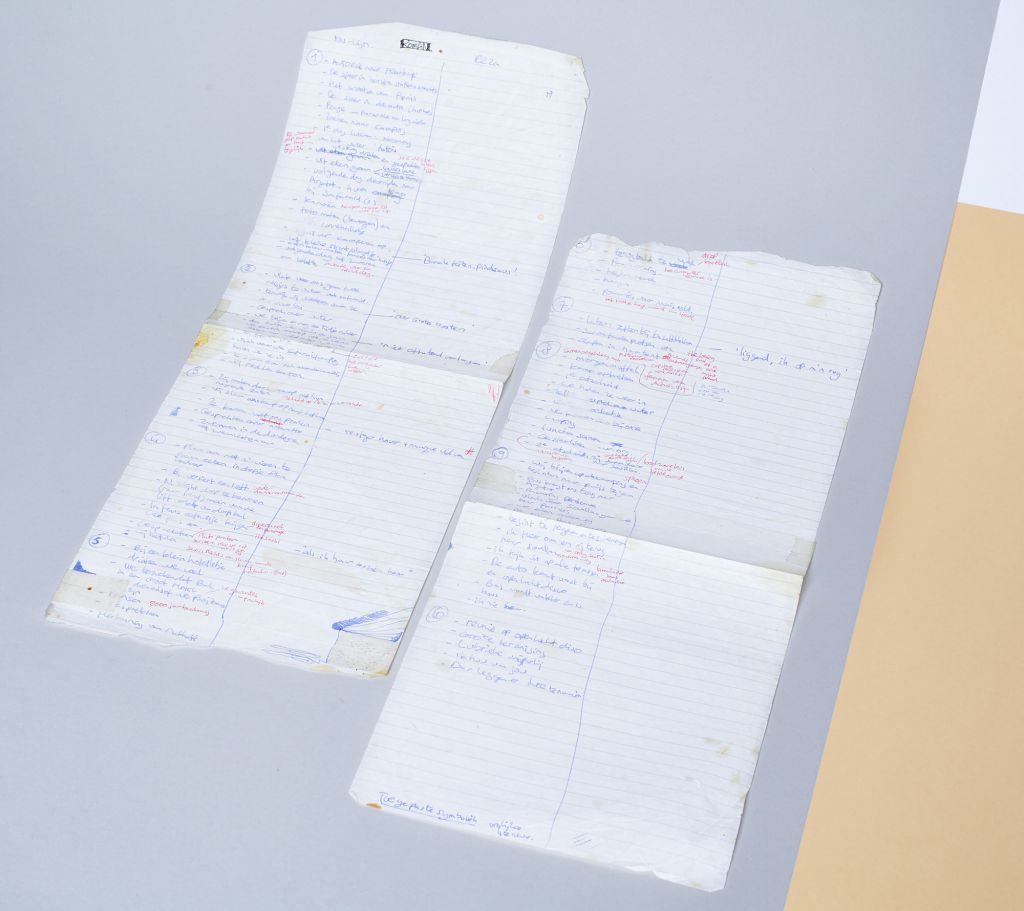 Gelukkig maar, want schrijven is een dynamisch proces en geen oefening om netjes binnen de lijntjes te kleuren. Tijdens het uitwerken komen vaak de beste ideeën en de kunst is om de juiste balans te vinden tussen het sturen, met vaste hand, en het loslaten om open te staan voor nieuwe invallen. Van die worsteling vertonen deze schema’s de sporen, van de plakbandjes tot de doodles van huisjes en paarden, tijdens het mijmeren getekend in de hoekjes.