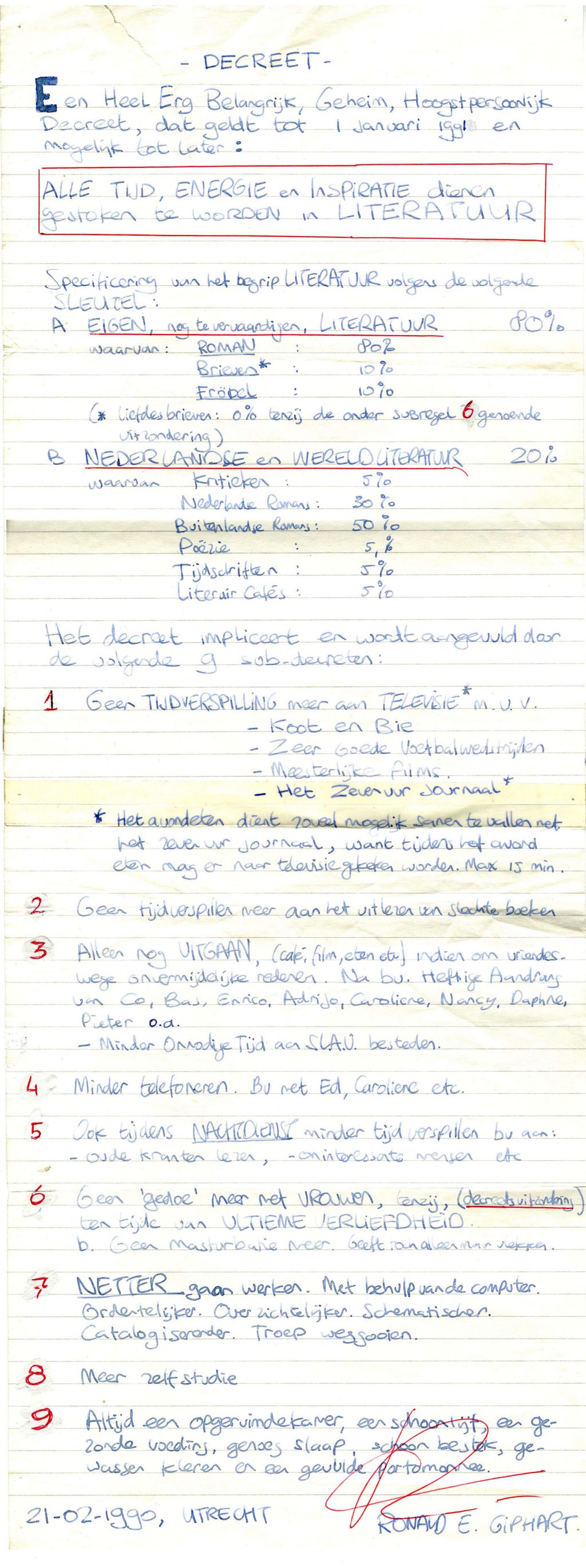 Wie het minder rigoureus wil aanpakken doet wat Ronald Giphart op 21 februari 1990 deed. Hij had net zijn studie Nederlands afgebroken, had een baantje als nachtportier in een ziekenhuis, en begon aan zijn roman, zijn eerste, die twee jaar later zou verschijnen als Ik ook van jou (1992). Giphart plakte twee blocnotevellen aan elkaar voor een ‘Een Heel Erg Belangrijk, Geheim, Hoogstpersoonlijk Decreet’. Negen leefregels spijkerde hij boven zijn bureau, die moesten bewerkstelligen dat alle energie en tijd voortaan alleen nog maar naar ‘LITERATUUR’ zouden gaan, zelfs nog uitgesplitst naar ‘EIGEN, nog te vervaardigen LITERATUUR’, die 80 procent van alle tijd moet krijgen, tegenover de 20 procent die naar romans van anderen, tijdschriften, kritieken en literaire cafés mag gaan.