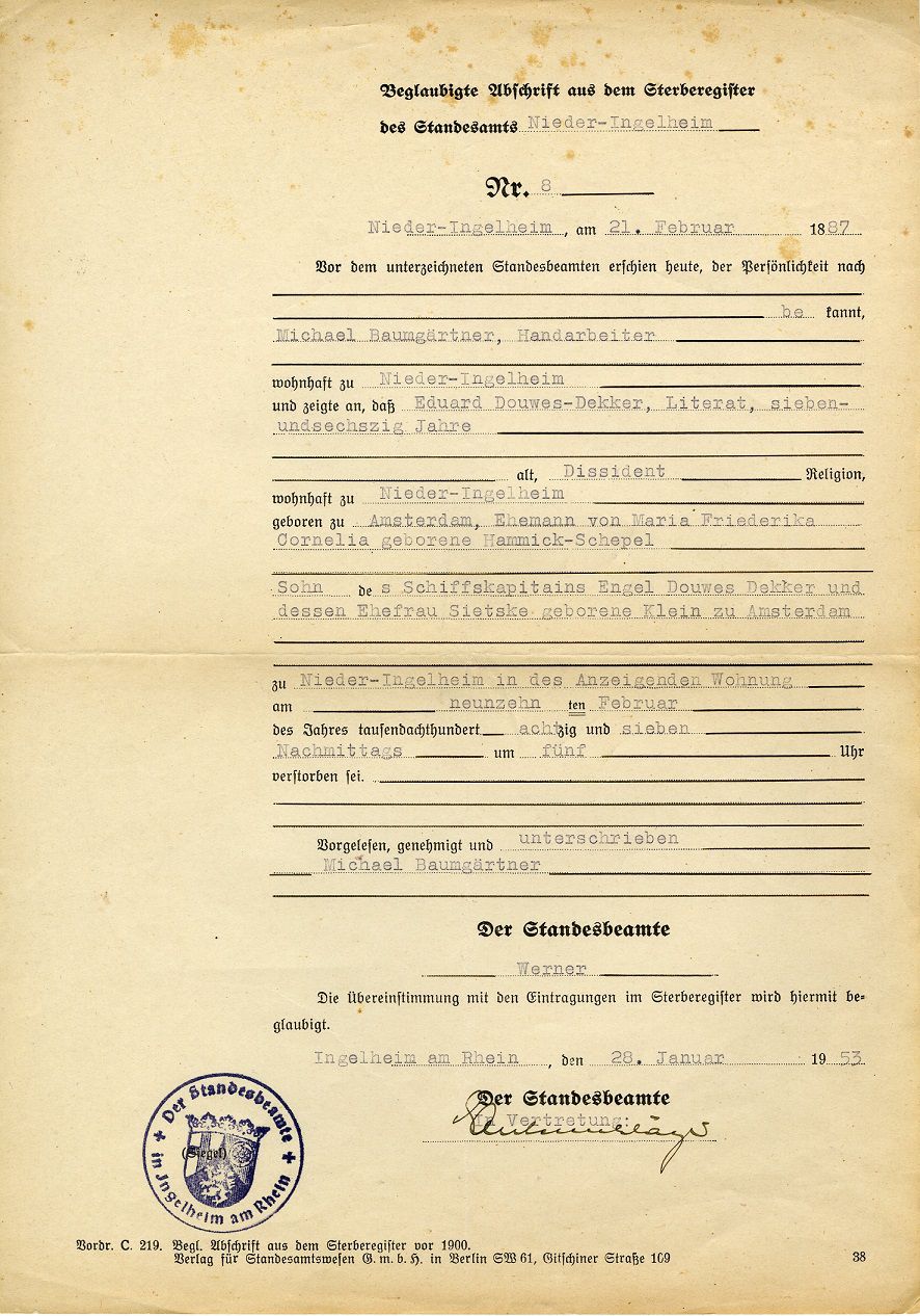 Het document dat het Literatuurmuseum bezit, is een afschrift dat met de typemachine uit het ‘Sterbregister’ van vóór 1900 is overgeschreven, in 1953, getekend door een ‘Standesbeambte’, die de overeenkomst verklaart met het originele register. Een stempel, wetsartikelen, lange omschrijvingen in gotisch schrift: alles eraan ademt Deutsche Gründlichkeit.
