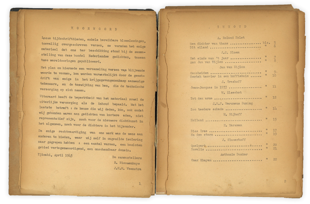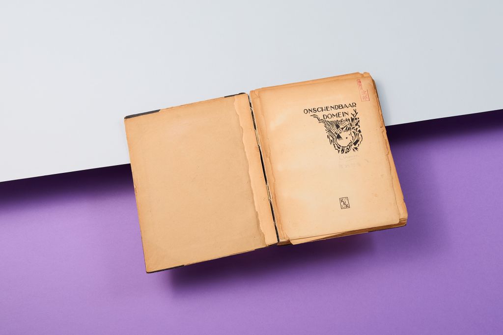Voor mij ligt een wat kwetsbaar ogend exemplaar van de poëziebloemlezing Onschendbaar domein. De oorspronkelijke eigenaar heeft met potlood zijn naam op het omslag geschreven: L. Vroman. Daaronder staan enkele karakters in het Kanji, een Japans schrift dat Leo Vroman zichzelf aanleerde toen hij geïnterneerd was in Tjimahi, nu Cimahi geheten. Deze oude garnizoensplaats lag enkele kilometers ten westen van Bandung en groeide tijdens de Japanse bezetting van Nederlands-Indië uit tot een van de grootste interneringslocaties op West-Java. Dit was ook de plek waar Onschendbaar domein tot stand kwam. In totaal zijn er vijftien exemplaren gemaakt waarvan er drie bewaard zijn gebleven. Eén daarvan was in het bezit van Vroman en ligt nu in het Literatuurmuseum.