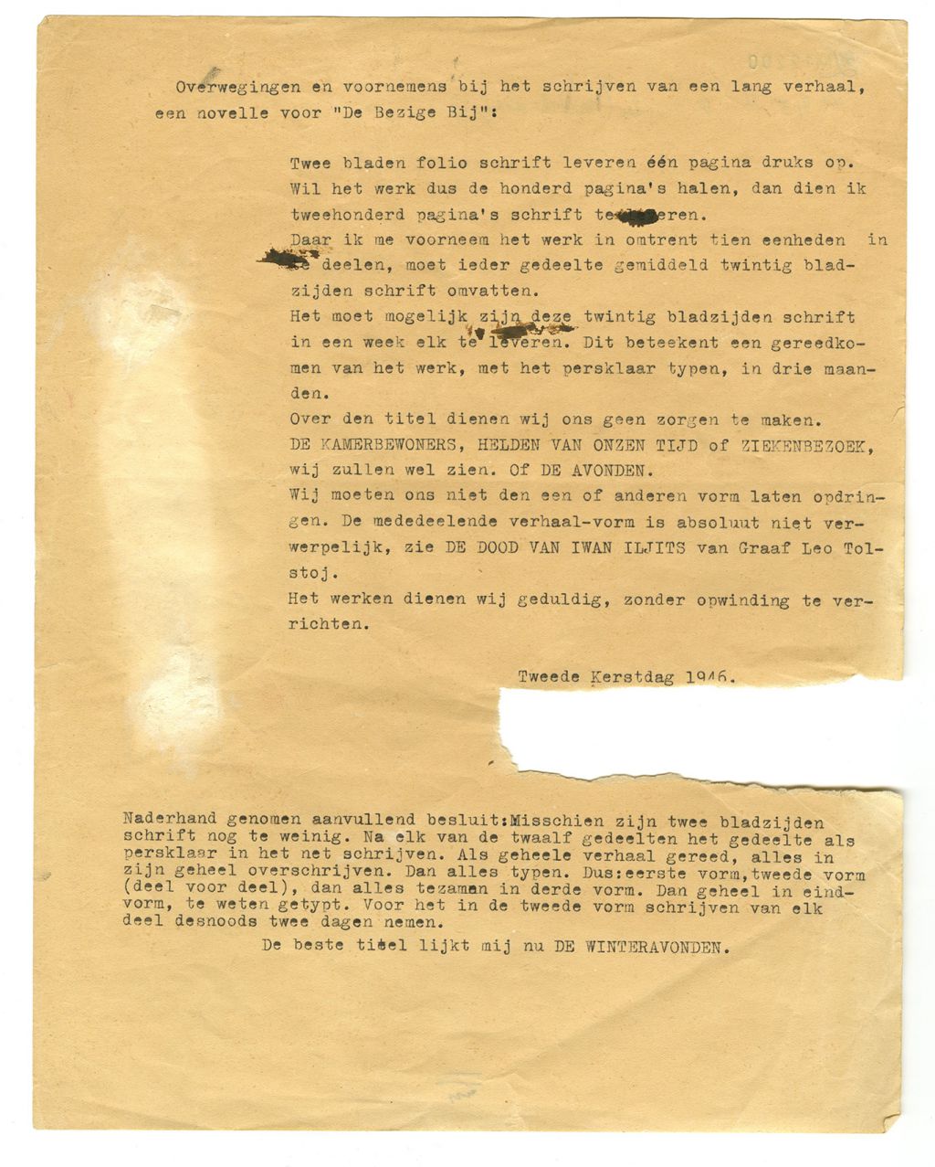 ‘Overwegingen en voornemens bij het schrijven van een lang verhaal, een novelle voor De Bezige Bij.’ Deze typische Reve-zin, bijna ambtelijk van toon, staat boven aan een briefje dat Gerard Reve – toen nog: Gerard Kornelis van het Reve – op tweede kerstdag 1946 aan zichzelf schreef.