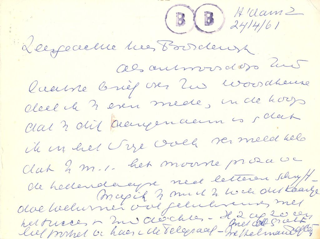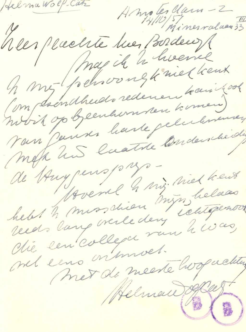 Op 14 oktober 1957 wordt er een handgeschreven, korte brief bezorgd bij de ‘zeer geachte heer Bordewijk’: ‘Mag ik u, hoewel u mij persoonlijk niet kent, van ganser harte feliciteren met uw laatste onderscheiding, de Huygensprijs.’ Was getekend met de meeste hoogachting, Helma Wolf-Catz (1900-1979), die in de brief ook nog melding maakt van haar ‘reeds lang overleden echtgenoot, die een collega van u was’. Misschien kende Bordewijk hem wel?