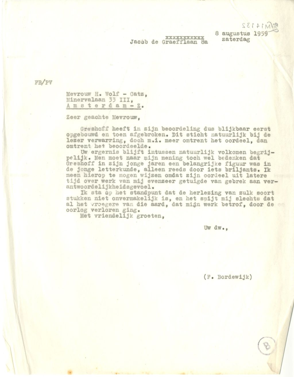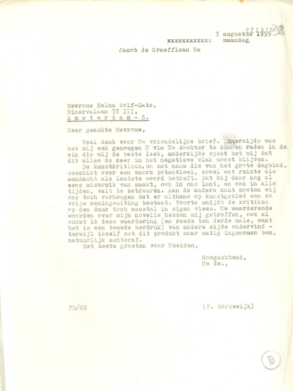 Het is geen schokkende of onthullende brief, geen brief die een ander licht werpt op de literatuurgeschiedenis of een van de betrokkenen. Toch valt vijfenzestig jaar later iets op aan deze brief, iets wat de hele bescheiden correspondentie tussen deze twee schrijvers blijkt te kenmerken: de onderdanigheid van Wolf-Catz, en de complete, bijna nonchalante vanzelfsprekendheid waarmee Bordewijk daarop reageert. Natuurlijk, Bordewijk (1884-1965) is anno 1957 een bejubelde schrijver; hij heeft Bint en Karakter al twee decennia eerder geschreven, hij is veel bekender dan Wolf-Catz. Tegelijkertijd heeft zij al een rits romans en novellen op haar naam staan, die zeker in de jaren zestig luid worden geprezen. Op papier gaat het hier dus om twee min of meer gelijken. Wie deze correspondentie leest, krijgt echter de indruk dat zij een pupil is en hij de gelauwerde, op zichzelf gerichte docent.