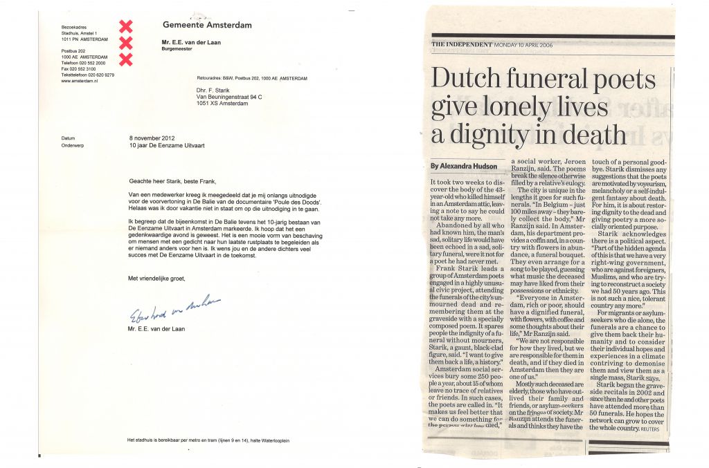 Het is voor een groot deel aan deze Ger Fritz te danken dat dichter F. Starik slaagde in zijn voornemen om een groep dichters (de ‘Poule des Doods’) te verzamelen die uitvaarten opluisteren waarbij geen nabestaanden werden verwacht. Om te voorkomen dat daklozen, illegale vluchtelingen en vereenzaamde ouderen met louter gemeentelijk ceremonieel begraven zouden worden, worden er al sinds 2002 in Amsterdam dichters uitgenodigd die speciaal voor de gelegenheid een gedicht schrijven. F. Starik ontleende het idee aan de toenmalige stadsdichter van Groningen, Bart FM Droog. Hij deed dat met verve – de uitvaartdichter is een geaccepteerd verschijnsel: ‘Er komt niemand van het verpleegtehuis, kinderen hebben al jaren geen contact meer met moeder, dus ik ga een dichter regelen’, is inmiddels geen ongebruikelijke uitspraak meer bij de gemeente.