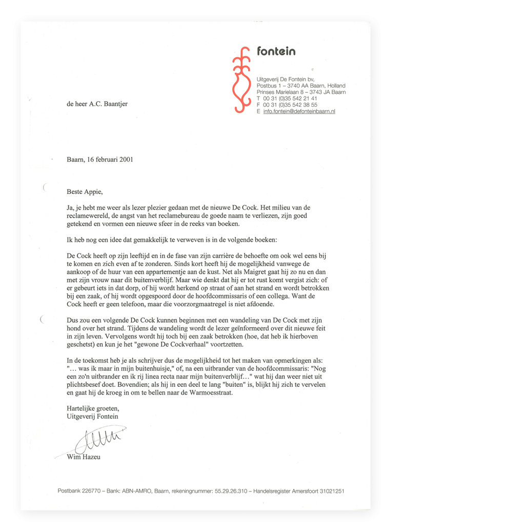 Wat doet een uitgever precies? Leest hij alles wat hij publiceert, stuurt hij misschien zelfs de plot bij, of richt hij zich alleen op de grotere, zakelijke lijnen van zijn fonds? Het komt allemaal voor, maar de brieven van uitgever Wim Hazeu (1940) aan schrijver Appie Baantjer (1923-2010) laten zien dat zij een stevigere band ontwikkelden dan uitgevers en auteurs gewoonlijk doen. In de meeste brieven is de toon van Hazeu weliswaar keurig, op het formele af, en in de correspondentie wordt weinig persoonlijks gedeeld, maar toch: bijna vijftien jaar schrijft Hazeu Baantjer maandelijks, en in die brieven toont hij zich allesbehalve zomaar een uitgever die toevallig met een succesvolle misdaadschrijver werkt. Nee, Hazeu ontfermt zich hartstochtelijk over het oeuvre van Baantjer, hij deelt inhoudelijke overpeinzingen, legt verbanden tussen afzonderlijke Baantjer-titels, ziet toe op het commerciële en internationale leven van De Cock en Vledder.