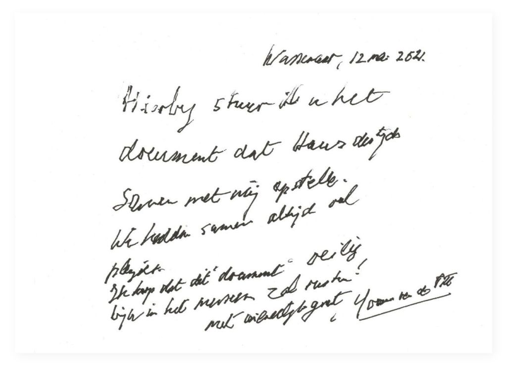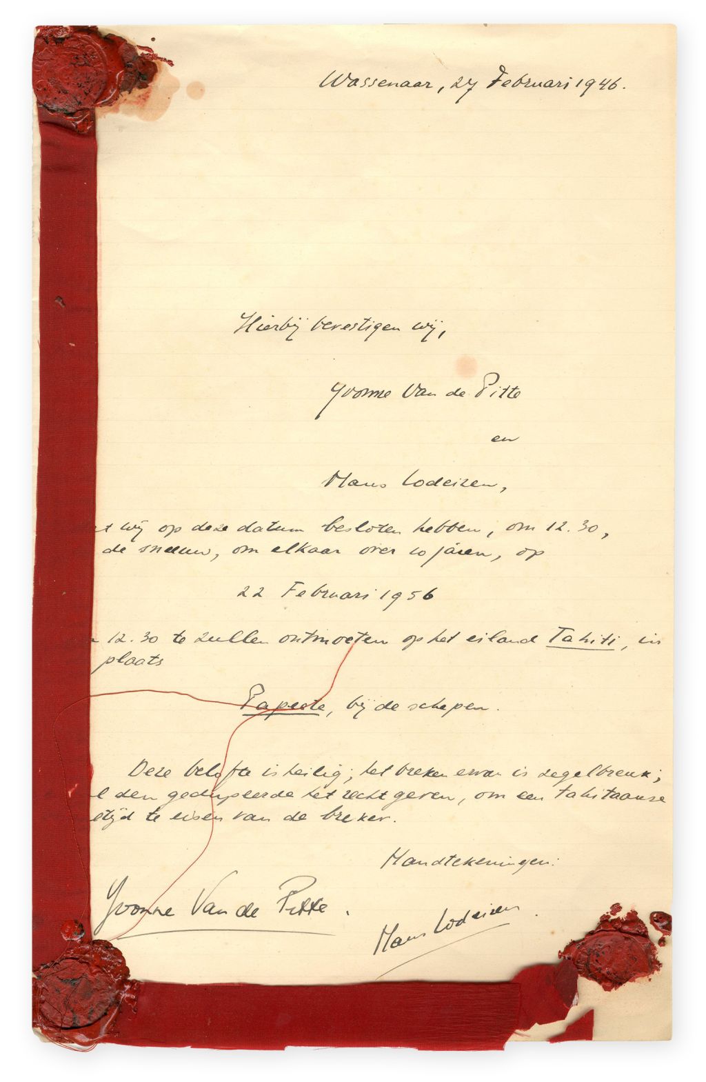 Dat is een feit en voor dat feit is er bewijs. Het bewijs ligt in het Literatuurmuseum, het is een document met een felrood zegel, gedecoreerd met felrode lintjes. Opgesteld in een secuur en sierlijk handschrift en door twee mensen ondertekend op 27 februari 1946. De 21-jarige Hans en zijn nichtje Yvonne van der Pitte. Ze beloven elkaar om over exact tien jaar samen op Tahiti te zijn. Ze spreken af bij de schepen, in de haven van Papeete, om 12:30 exact.