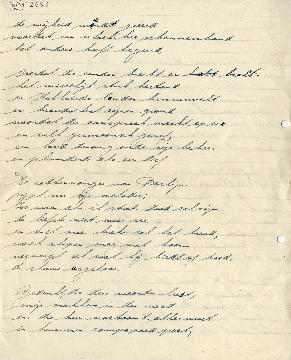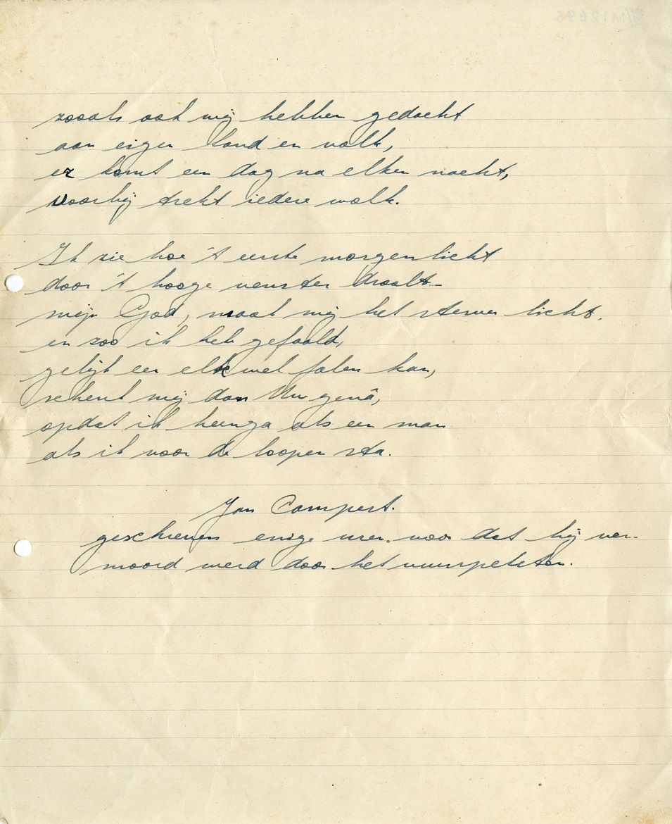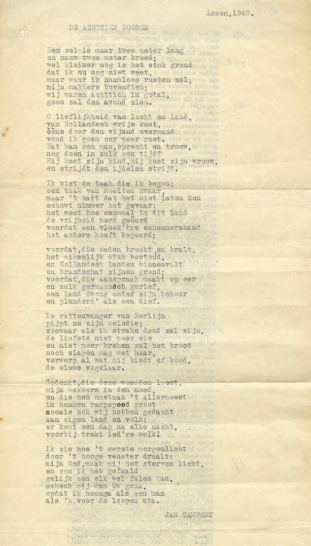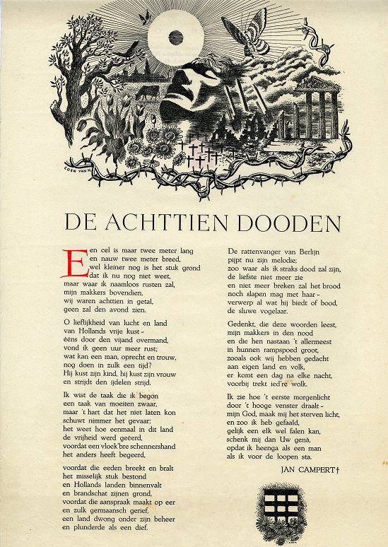 Uitgeverij De Bezige Bij vierde op 12 december 2019 haar vijfenzeventigste verjaardag. Het was een geschikt moment om stil te staan bij haar eerste uitgave, anderhalf jaar voor de officiële oprichting: het gedicht ‘Het lied der achttien dooden’ van schrijver, dichter, journalist Jan Campert. Hoewel het originele handschrift niet bewaard lijkt te zijn, bezit het Literatuurmuseum vele afschriften ervan uit de oorlog en de diverse rijmprenten die van het gedicht zijn gemaakt: ‘Als er een rijmprent is van “Het lied”, dan hebben we die,’ aldus een van de medewerkers van het museum.