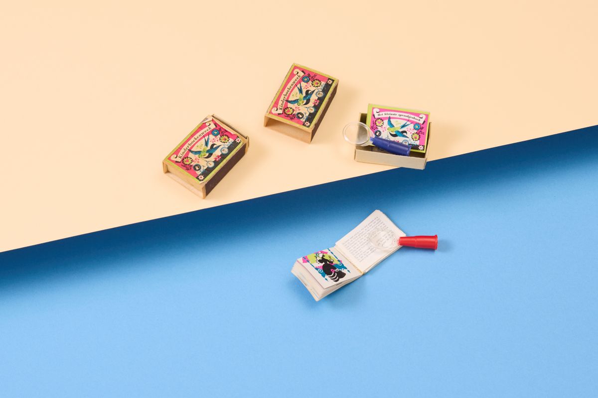 Het boekje past makkelijk in de palm van mijn hand. Het meet om precies te zijn 4,5 bij 2,8 centimeter en komt in een bontgekleurd luciferdoosje mét een minivergrootglas. Dit laatste heeft iets paradoxaals – een instrument dat dient om zaken te vergroten, terugbrengen tot klein formaat. Eén ding is zeker: dit Kinderboekenweekgeschenk spreekt tot de verbeelding.