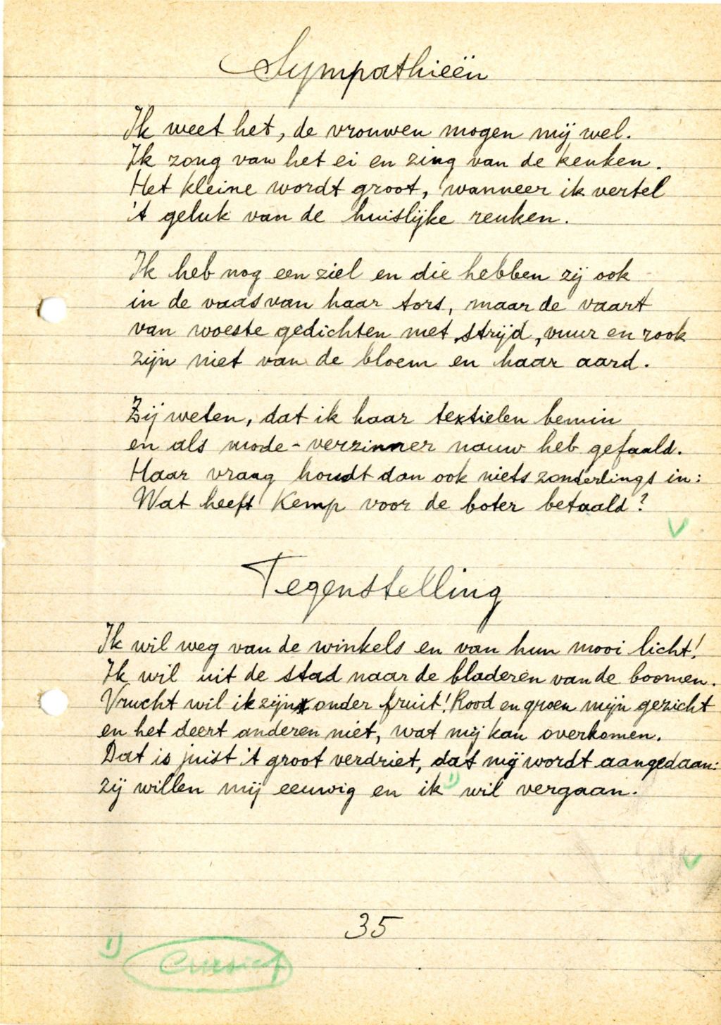 De eerste twintig jaar van mijn leven woonde ik in de mijnstreek, geboren en getogen in Limburg dus. Tig leraren Nederlands heb ik in al die jaren versleten, veelal leraren die trotser waren op het Limburgs dialect dan op het Nederlands. Maar geen enkele docent wees mij ooit op de Maastrichtse dichter Pierre Kemp (1886-1967). Pas nu ik dertien jaar weg ben uit Zuid-Limburg kom ik voor het eerst in aanraking met de dichter, die tussen het dichten door ook nog eens achtentwintig jaar werkte op kolenmijn Laura in het Limburgse Eygelshoven. Niet als koempel en kolenhakker, maar bovengronds, bij het loonbureau. Hij ontving voor zijn oeuvre in 1956 de Constantijn Huygensprijs en 1958 de P.C. Hooft-prijs. Kemp was daarnaast (waar vond hij de tijd?) ook nog een zeer goed schilder.