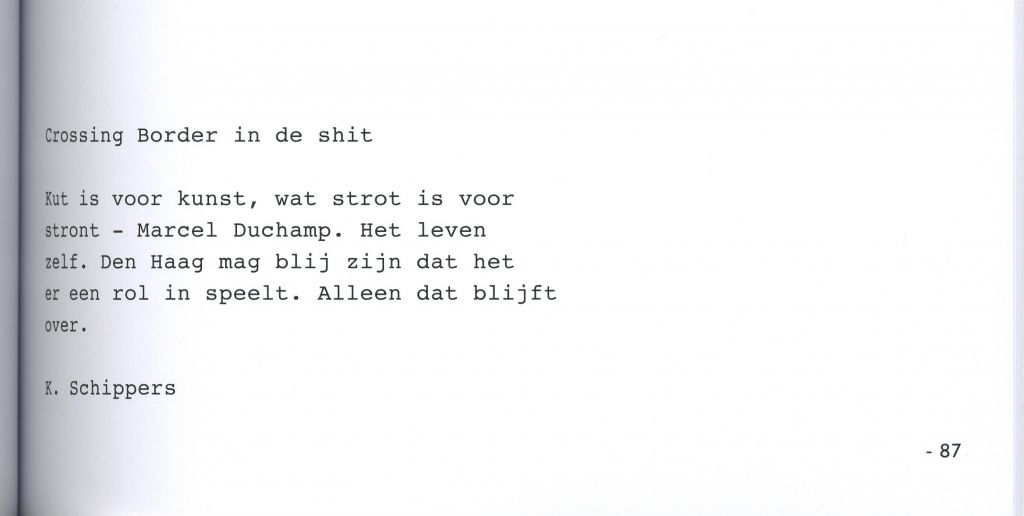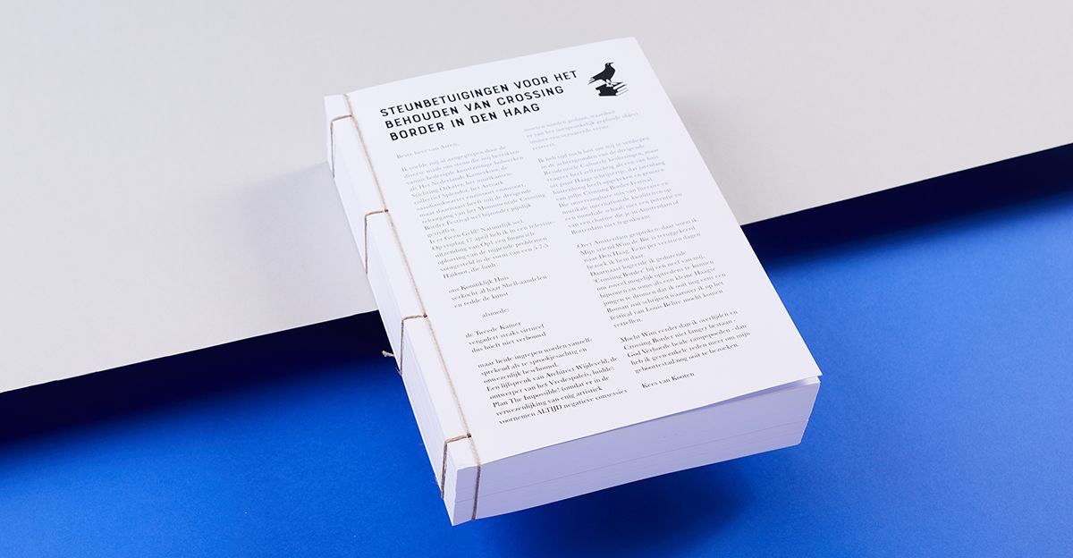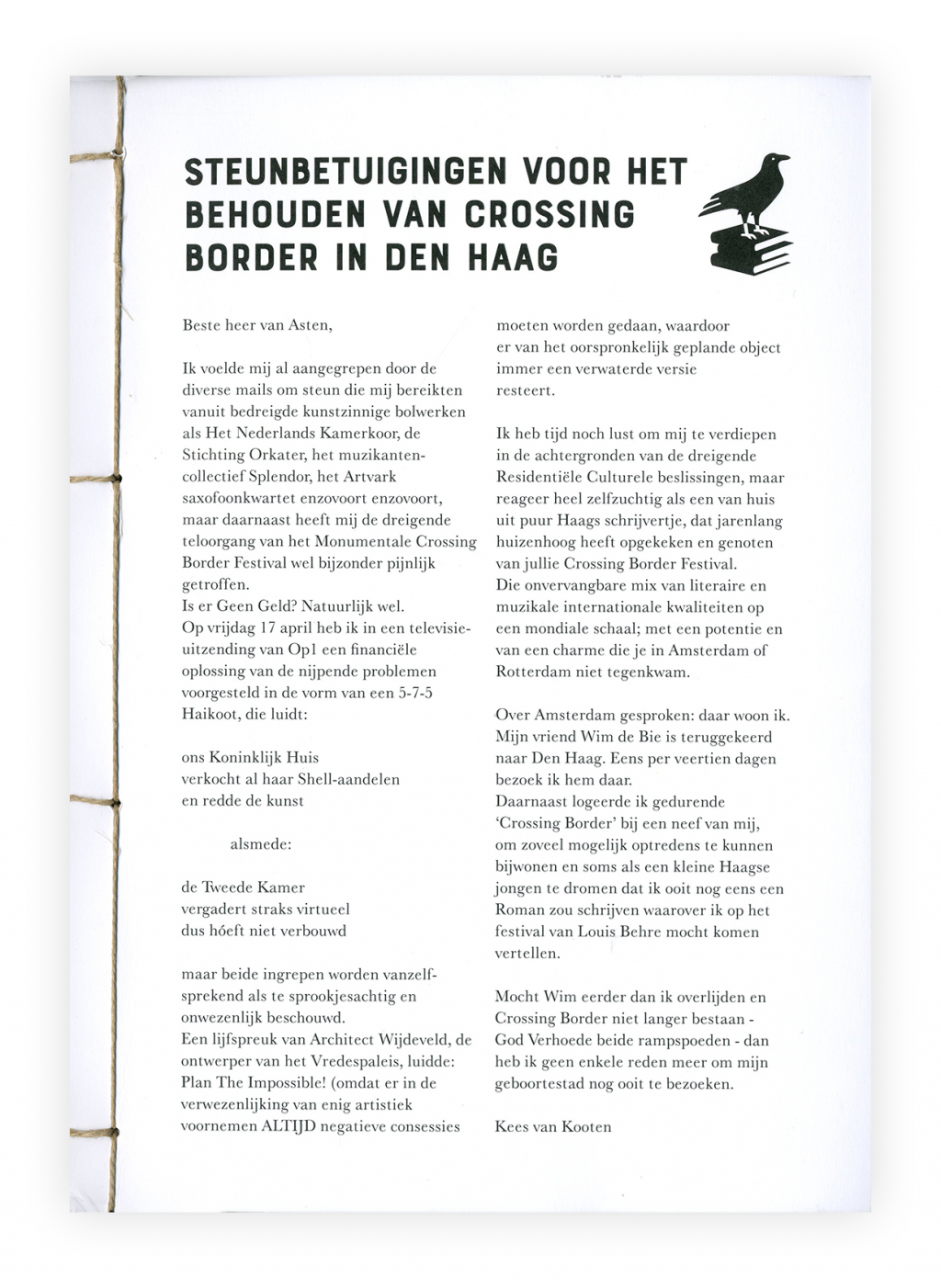 Het boek heeft geen kaft: op de voorpagina prijkt de in kapitalen geschreven tekst ‘Steunbetuigingen voor het behouden van Crossing Border in Den Haag’ en het kenmerkende zwarte vogeltje dat op een boekenstapel rust. In deze context roept dit de associatie op met een kraai die een lijk bepikt: nog even en bij de literatuur valt niets meer te halen. Daaronder is een brief van de van oorsprong Haagse schrijver Kees van Kooten afgedrukt, die zich direct tot de wethouder richt.