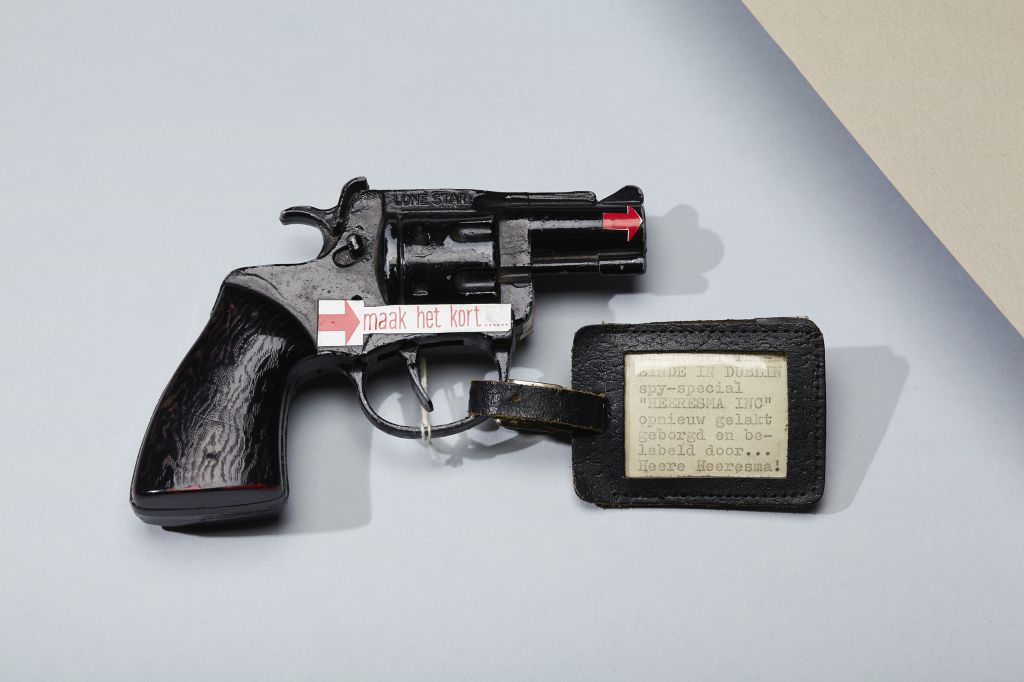 In de opslag van het Literatuurmuseum ligt een vuurwapen. Het is een kleine, zwarte revolver, het soort dat ik ken uit films waarin russian roulette wordt gespeeld: één kogel in het magazijn, het wapen tegen iemands slaap gedrukt, op het moment dat de trekker wordt overgehaald is er 16,66% kans op een schot (als er tenminste zes patronen in de revolver passen. En die kans neemt vervolgens alleen maar toe). Op beide zijkanten van de revolver zit een witte sticker die met rode letters aangeeft: maak het kort… Op de loop zit ook een sticker, een rode pijl die doet denken aan een verkeersbord, alsof hij de kogel de juiste kant op wil sturen. Aan het handvat bungelt een klein, geplastificeerd briefje met de getypte tekst: reismodel TEN-EINDE IN DUBLIN spy-special “HEERESMA INC” opnieuw gelakt geborgd en gelabeld door… Heere Heeresma. Pas wanneer ik dat briefje lees, en vooral wanneer ik voel hoe licht het wapen is, realiseer ik me dat het om een speelgoedrevolver gaat. Er passen helemaal geen kogels in. Er is nooit een schot mee gelost of russian roulette mee gespeeld. Het is uitsluitend gebruikt voor een verhaal. Over echte wapens en echte schoten. Preciezer: voor de thriller Teneinde in Dublin, die in 1969 verscheen.