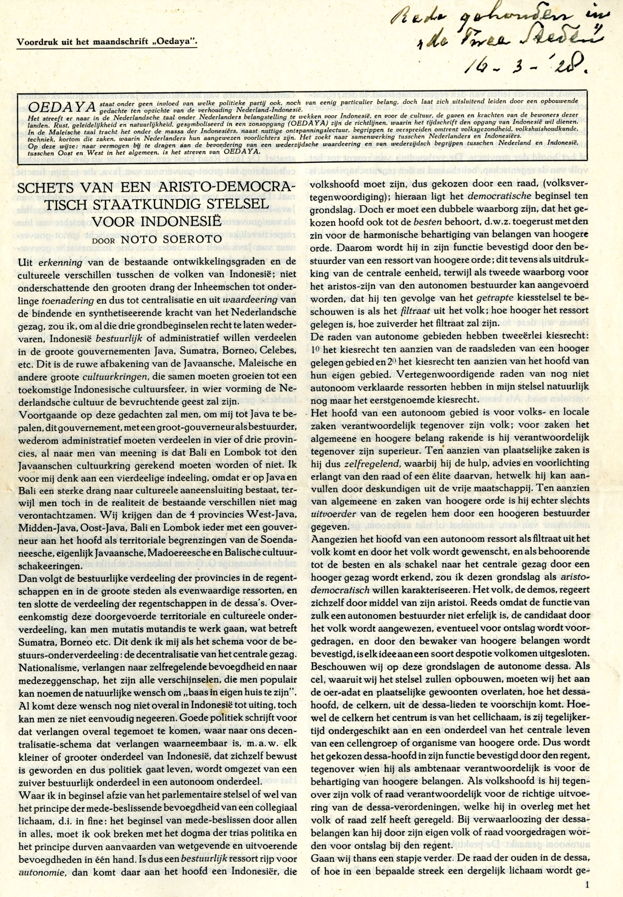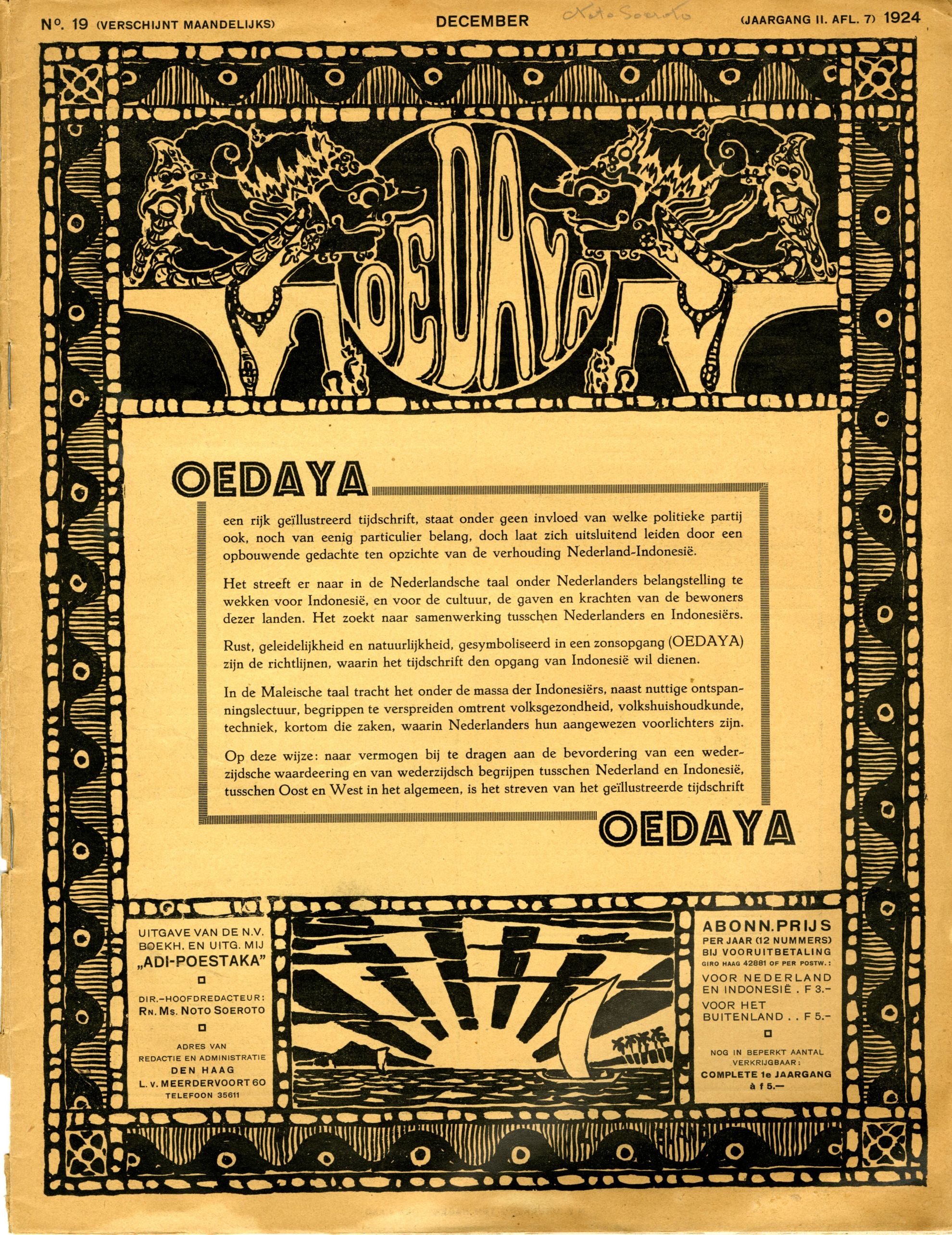 Hij werd de ‘apostel voor een verbroedering van Oost en West’ genoemd: schrijver, dichter en uitgever Raden Mas Noto Soeroto (1888-1951) pleitte zijn leven lang voor verbinding tussen de Nederlandse en Indonesische volken – ook nadat Indonesië onafhankelijk werd. Zijn standpunt maakte hem in nationalistische kringen tot een omstreden figuur, en ondanks zijn status als bruggenbouwer eindigde zijn leven in isolement.