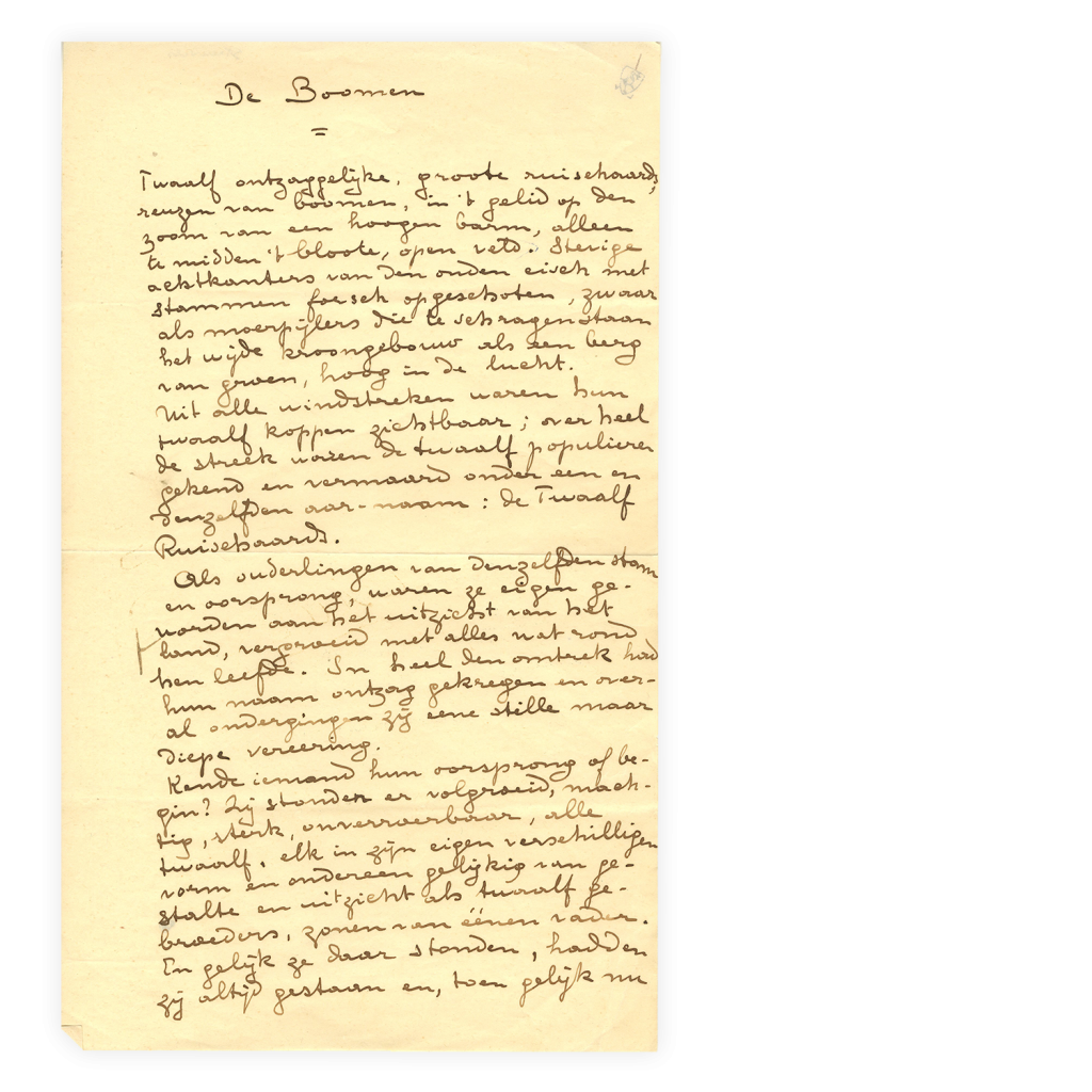 In 1909 verscheen in De Nieuwe Gids het verhaal ‘De bomen’ van Stijn Streuvels (1871-1969). De plot ervan lijkt even bedrieglijk eenvoudig als de titel: twaalf stokoude populieren worden gerooid nadat het land van eigenaar verandert. Veel meer gebeurt er niet, maar Streuvels, grootmeester van de boeren- en streekroman, weet deze vertelling tot een poëtisch juweeltje te boetseren. In 1919 verscheen ze apart in boekvorm, en meer dan een eeuw later ontpopt ‘De bomen’ zich tot een uiterst actuele parabel over de verhouding tussen mens en natuur.