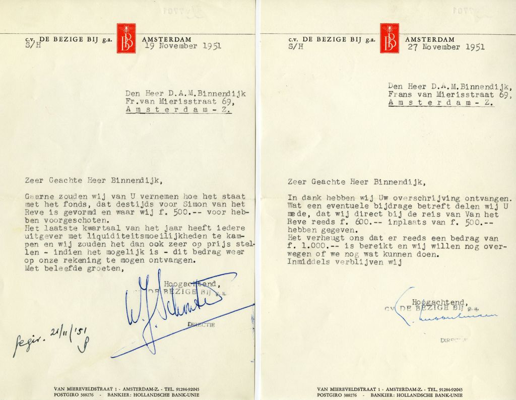 Nop Maas schrijft in zijn Reve-biografie dat het eindbedrag op ƒ 1000,- uitkomt ‘door een majeure bijdrage van uitgever Bert Bakker’. Van hem zijn twee brieven bewaard in het dossier. Op 30 augustus informeert Bakker bij Binnendijk naar de kwestie ‘Simon v.h. Reve’: hij weet nog dat ze erover gesproken hebben op kunstenaarssociëteit De Kring, vereeuwigd in het magistrale zevende hoofdstuk van De avonden als de uitgaansgelegenheid waar Frits van Egters en zijn vrienden in hoog tempo borreltjes naar binnen gieten. Bakker deed niet voor hen onder, zo blijkt: hij herinnert zich een toezegging te hebben gedaan, maar ‘tengevolge van het drankgebruik van die avond weet ik niet meer de finesses’.
