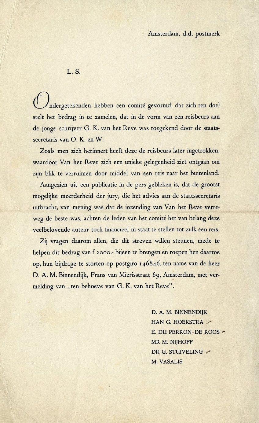 Uitgever Geert van Oorschot had de circulaires en de enveloppen laten drukken, de kosten (ƒ 43,50) declareert hij bij het comité: ‘Als mijn b[ij]drage kan dan worden beschouwd de portokosten voor 1000 exemplaren en het vele werk van de adressering.’ De drukkosten komen hoofdelijk voor rekening van de leden van het comité: Binnendijk verzoekt hen om ƒ 7,25 aan hem over te maken. In dezelfde brief meldt hij dat er circa 500 gulden is ingezameld en dat Van het Reve hem gevraagd heeft of hij dit bedrag voor een vakantie in Schotland kan benutten. Het is echter nog steeds de bedoeling de volledige som van 2000 gulden op te halen, ‘ook al zou dit nog geruime tijd vergen. Ik heb daarom geen vrijheid gevonden, het bedrag van Fl. 500.- aan van het Reve terhand te stellen, ofschoon hij mij heeft verzocht dit te doen.’