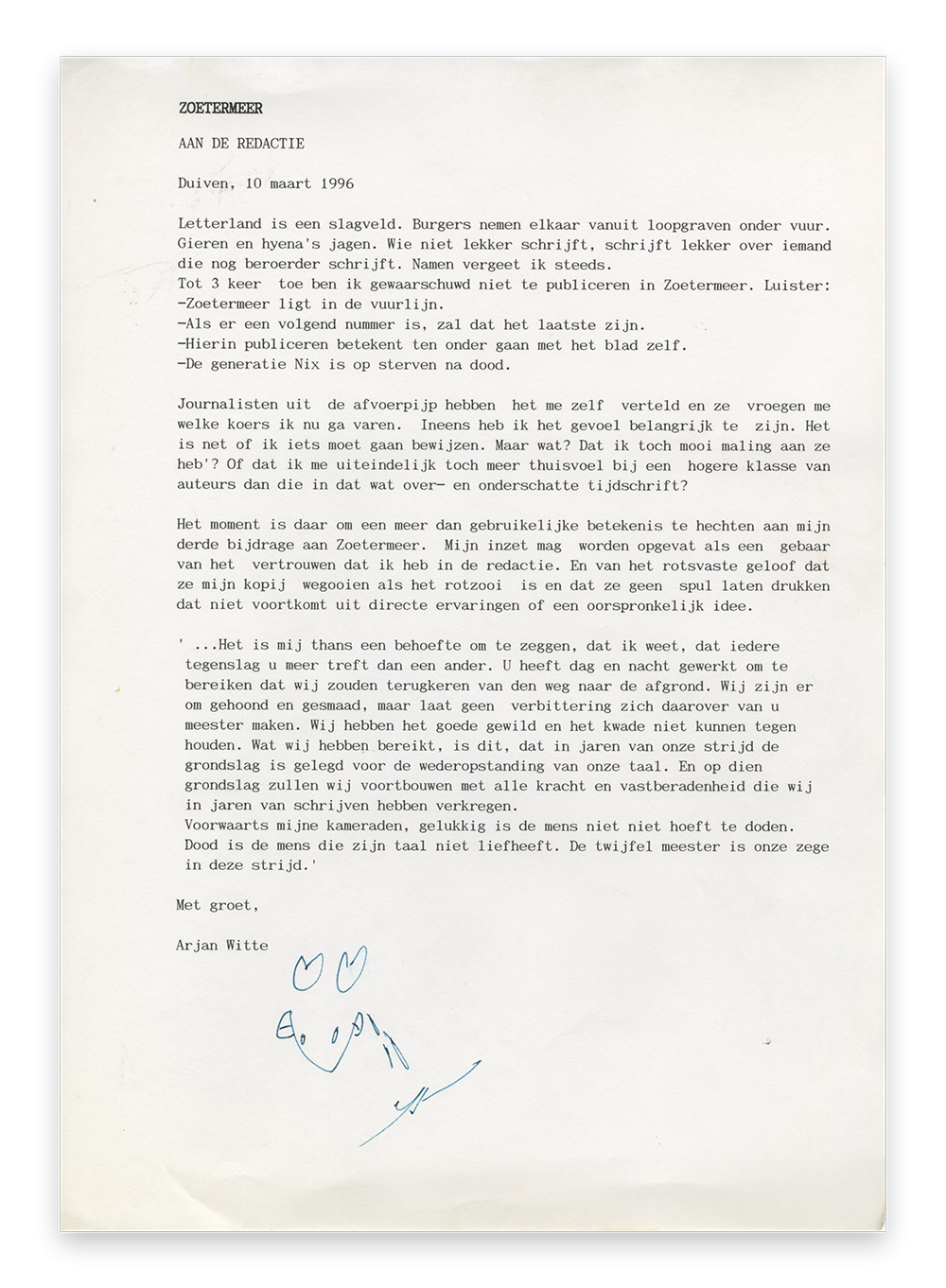 Het archief van Menno Wigman bevat een opmerkelijke brief. Het schrijven dateert van 10 maart 1996, toen Wigman redacteur was van Zoetermeer, het literaire tijdschrift dat in 1994 was opgezet door Rob van Erkelens, Ronald Giphart en Joris Moens. De afzender, Arjan Witte, schrijft het volgende: