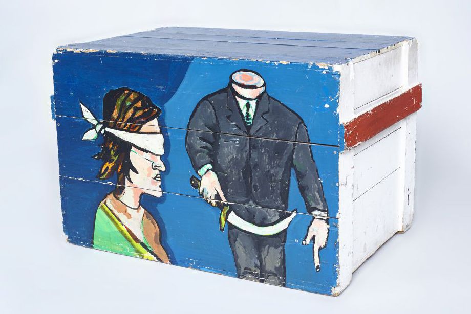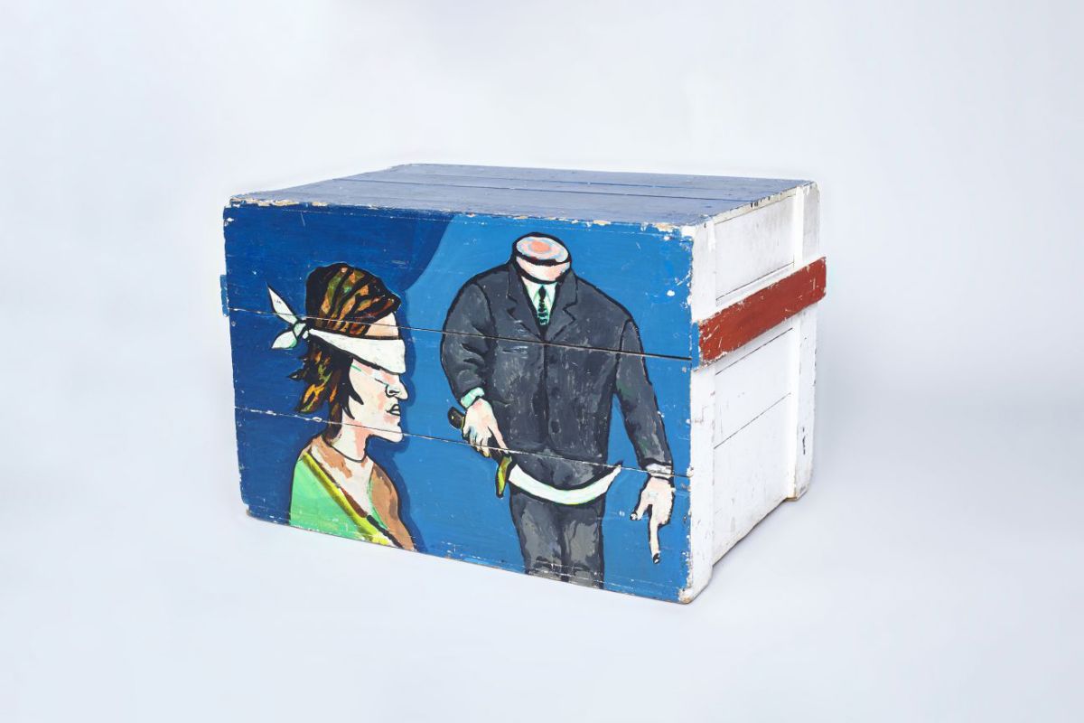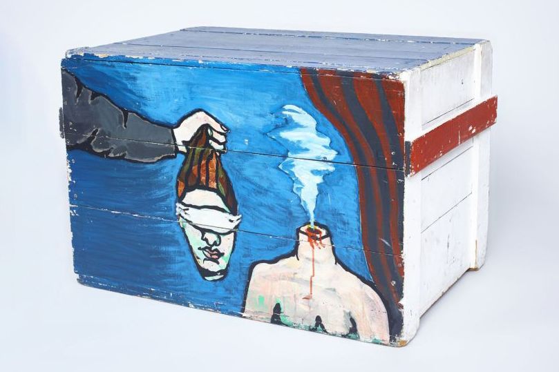 Het is een grote kist, gemaakt van stevig hout. De korte kanten zijn witgeschilderd, de deksel laat onder een dikke zwarte verflaag alleen nog een vermoeden bestaan van een figuur in rood en groen. Maar op de lange kanten speelt zich een drama in twee delen af.