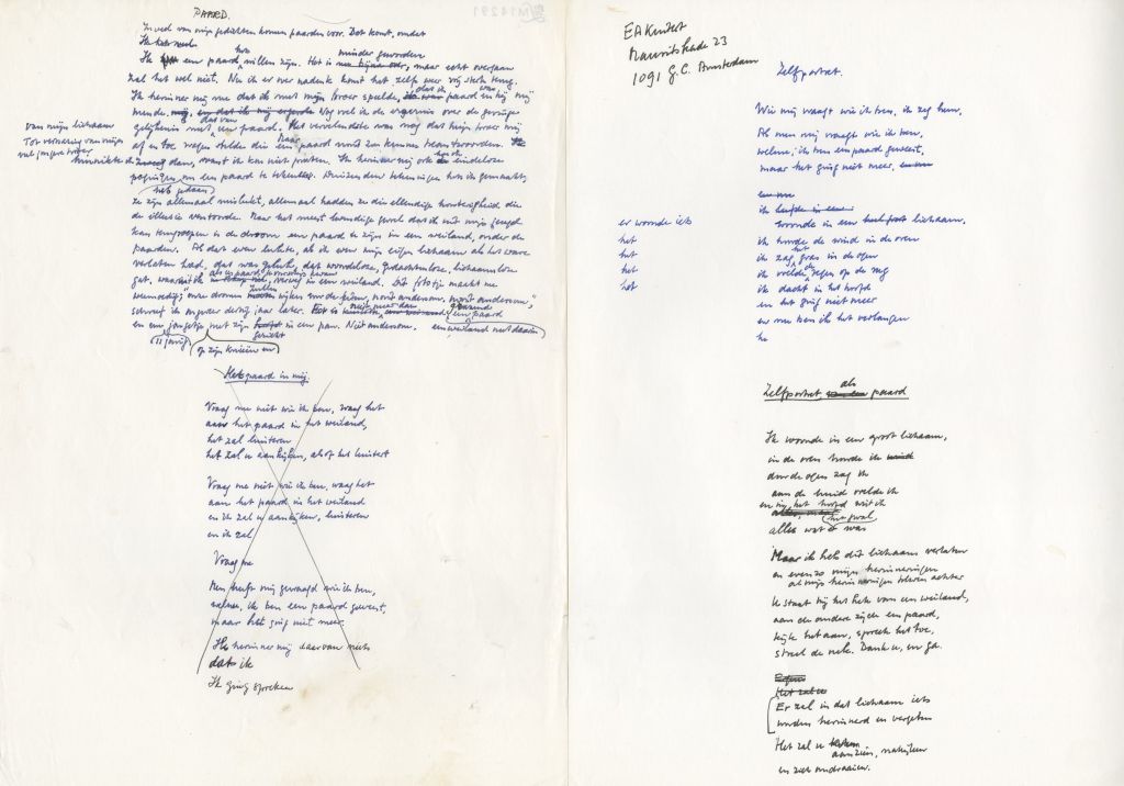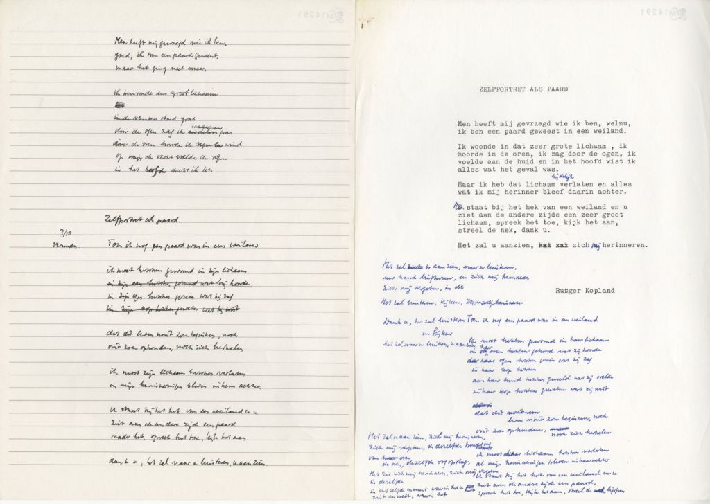 Een wens, een verlangen uit de kindertijd, wordt vele jaren later de voedingsbodem voor een gedicht, ‘Zelfportret als paard’ (Tot het ons loslaat, Van Oorschot 1997). In het archief van het Literatuurmuseum bekijk ik de totstandkoming ervan.