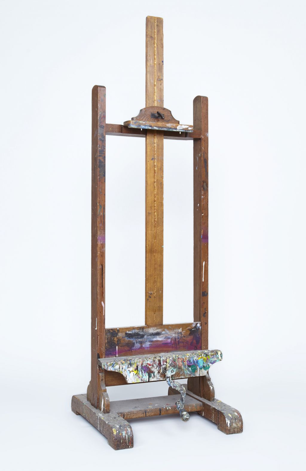 Jaren later sta ik in het archief van het Literatuurmuseum voor zijn schildersezel. Een houten gevaarte, hoger dan ik, stoffig en stevig. Het is bedekt met vegen en spatten. Vooral op de richel waar het doek gestaan heeft: klodders verf als duivenpoep, een dikke laag. Op deze houten lat heeft ieder werk gerust. Of liever nog: geworsteld met de vaste vorm die het zou krijgen. In roze, geel, turquoise: sporen van een felle strijd. Daarna hebben de doeken zich verspreid, over musea en zitkamermuren.