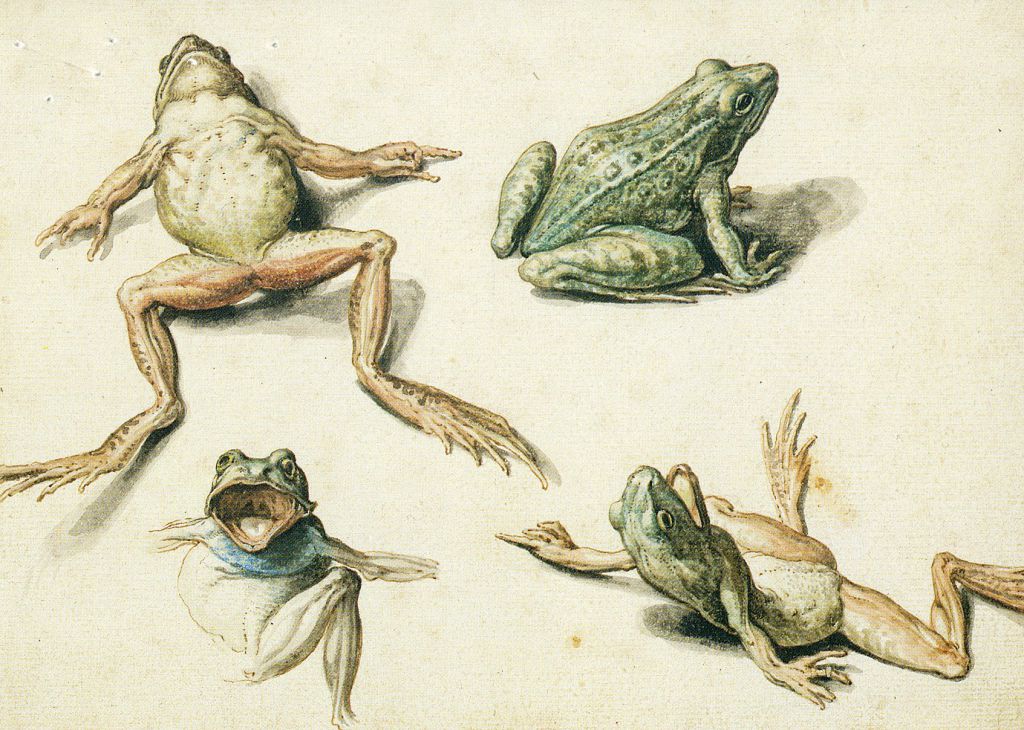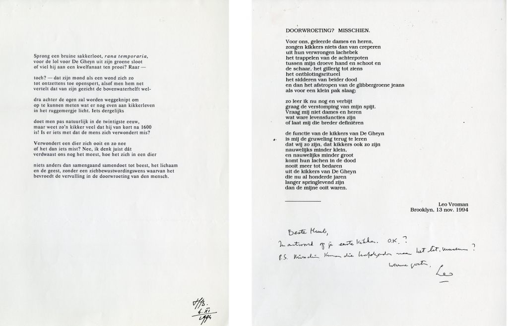 ‘Ik kan nu van alles en nog wat gaan opnoemen van wat ik er goed aan vind (…) maar het lijkt me weinig zinvol citaten uit Brooklyn naar Brooklyn terug te sturen. Hoewel ik toch nog kwijt wil dat ik dat verhaal van die doorgeknipte kikkerkoppen niet meer kwijt raak. Ik vind het afschuwelijk en afgrijselijk fascinerend. Het zal er ook mee te maken hebben dat ik hier al een paar weken zit aan te kijken tegen een reproductie van een blad met vier kikkerstudies, gemaakt rond 1600 door [de Nederlandse schilder] Jacques de Gheyn II – ook hier, bij een onschuldige tekenaar, spelen het “gebiologeerd” zijn door de natuur en tegelijkertijd daarvoor en daardoor de natuur kwellen zo merkwaardig door elkaar als in jouw boek, want geen kikker die vrijwillig poseert, dunkt me. (…) Dat kikkerblad zal wel een dezer dagen of weken poëzie gaan opleveren: ‘‘Kikker van De Gheyn’’.*’