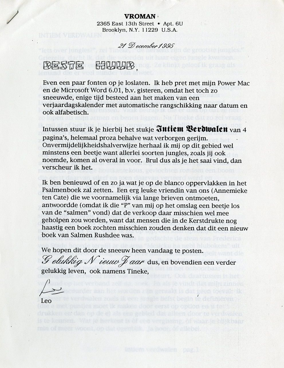 Beurskens voegt een door hemzelf geschreven essay toe over het werk van Vroman, die hij duidelijk bewondert. Zijn korte formele brief sluit hij af met de woorden: ‘Ik ben zo vrij om ook nog een bundeltje eigen poëzie mee te sturen dat ik in 1988, geheel buiten het uitgeefcircuit om, voor eigen geefplezier liet drukken. Niet om te laten zien hoe goed of belabberd ik het zelf kan, maar louter als blijk van waardering.’ Het gebaar wordt gewaardeerd door Vroman, zo blijkt als hij op 19 maart zijn antwoord stuurt: ‘Ik vind zowel de verzen mooi als het artikel boeiend. Het lijkt soms wel of we woorden achterlaten zoals het slijmspoor van een slak waar zout op is gestrooid. Elk woord is een eeuwig afscheid van het vorige ogenblik en welke daarvan ten slotte dan door de dood wordt aangedikt.’