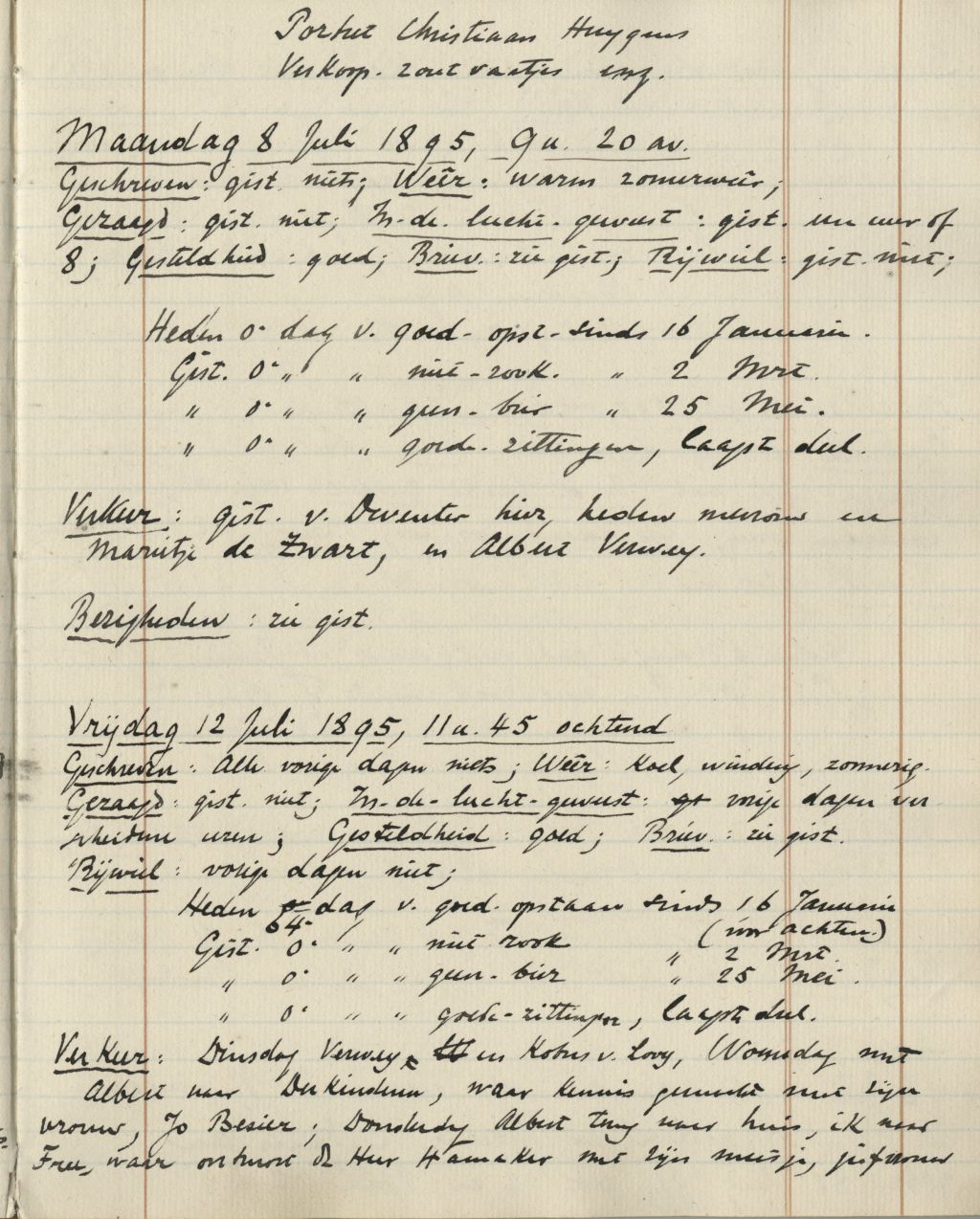 6 juli viel in 1895 op een zaterdag. Het was koel en bewolkt weer in Noord-Holland. Het was geen bijzondere dag, zeker geen dag die de geschiedenisboeken op enige manier zou ingaan, maar toch zie ik deze gegevens nu uitgeschreven voor me, met daaronder een hele rits andere details, opgetekend in een sierlijk handschrift. Ook van 7 juli 1895 kan ik een beschrijving vinden, of van 8 juli, of van 9 juli.