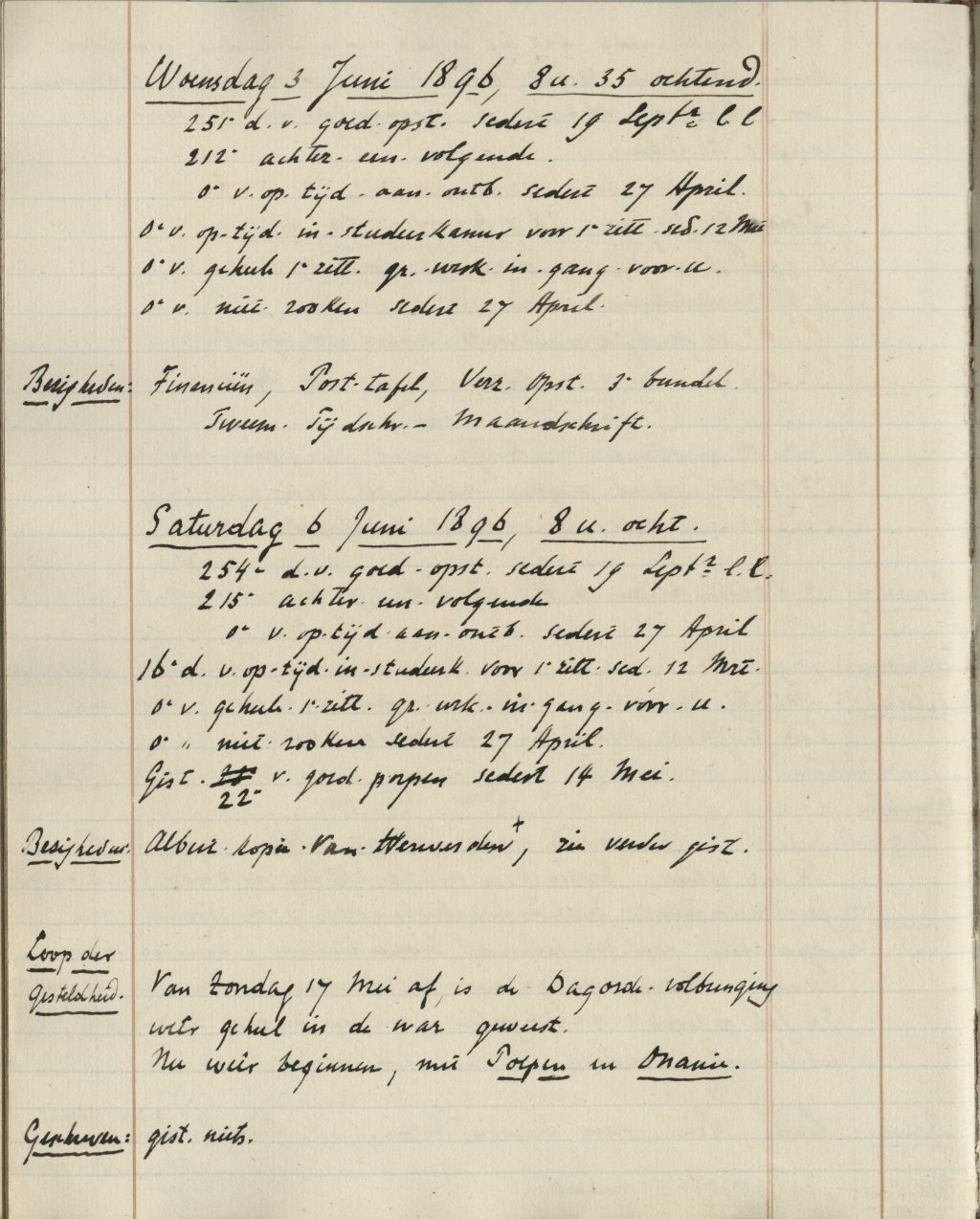 Bij al die dagen heeft Lodewijk van Deyssel namelijk dezelfde gegevens ingevuld, in een van zijn talloze dagboeken. Het gaat daarbij niet alleen om het weer, het gaat ook om talloze subcategorieën, waarover Van Deyssel regelmatig niets te melden heeft: ‘Rijwiel [gebruikt]’ bijvoorbeeld (meestal: niets), of ‘verkeer’, of ‘gezaagd’. Alsof hij iedere dag gedwongen werd een vragenlijst in te vullen om zijn bestaan zo goed mogelijk in kaart te brengen.