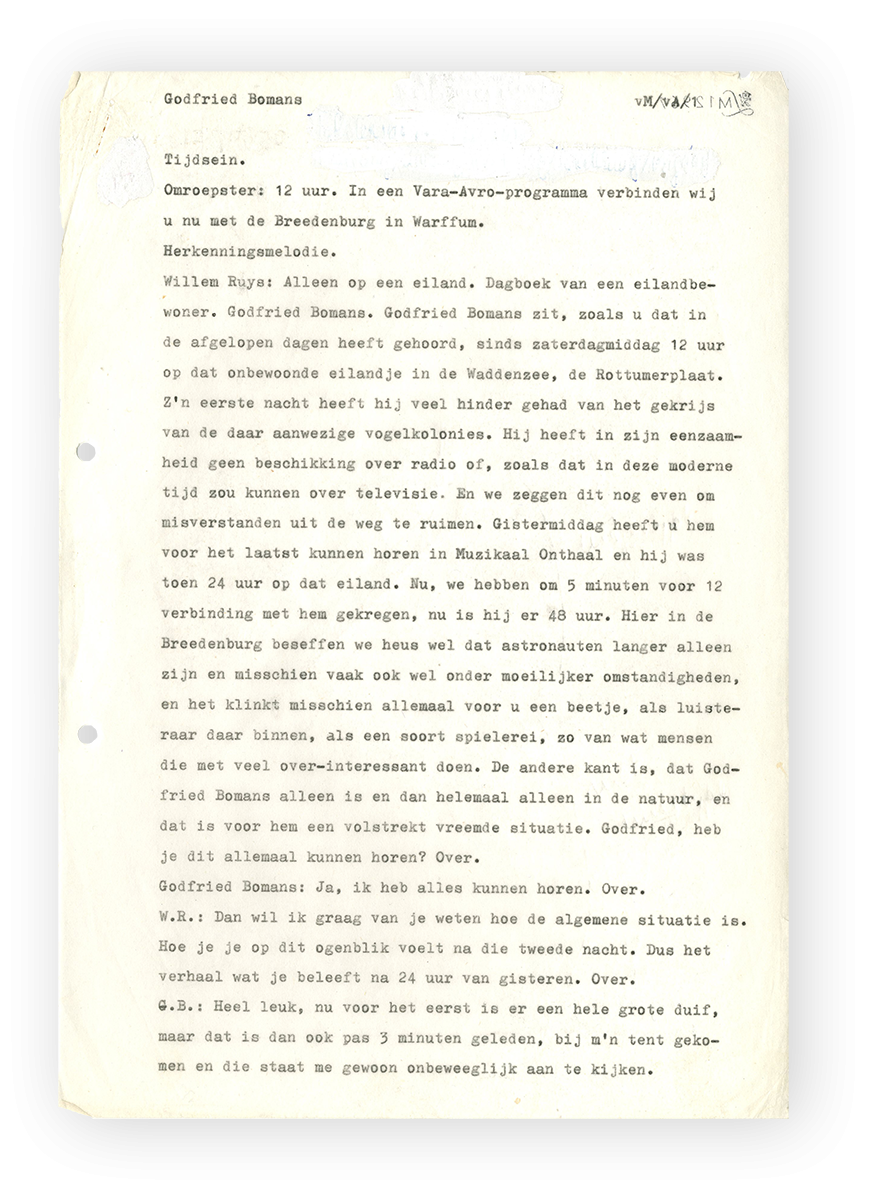 Het Literatuurmuseum beschikt ook over iets moois: een bijna volledig typoscript van enkele radio-interviews door Willem Ruis, vanaf de derde dag tot de dag voordat Bomans het eiland verlaat.