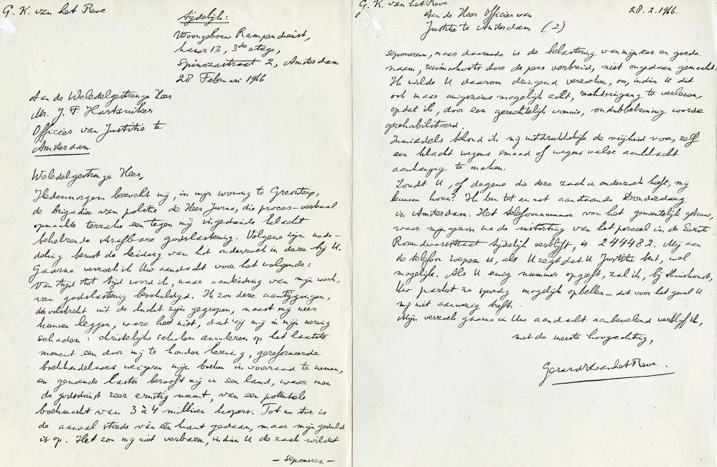 Brief van Gerard Reve aan de Officier van Justitie te Amsterdam, 28 februari 1966. Collectie: Literatuurmuseum