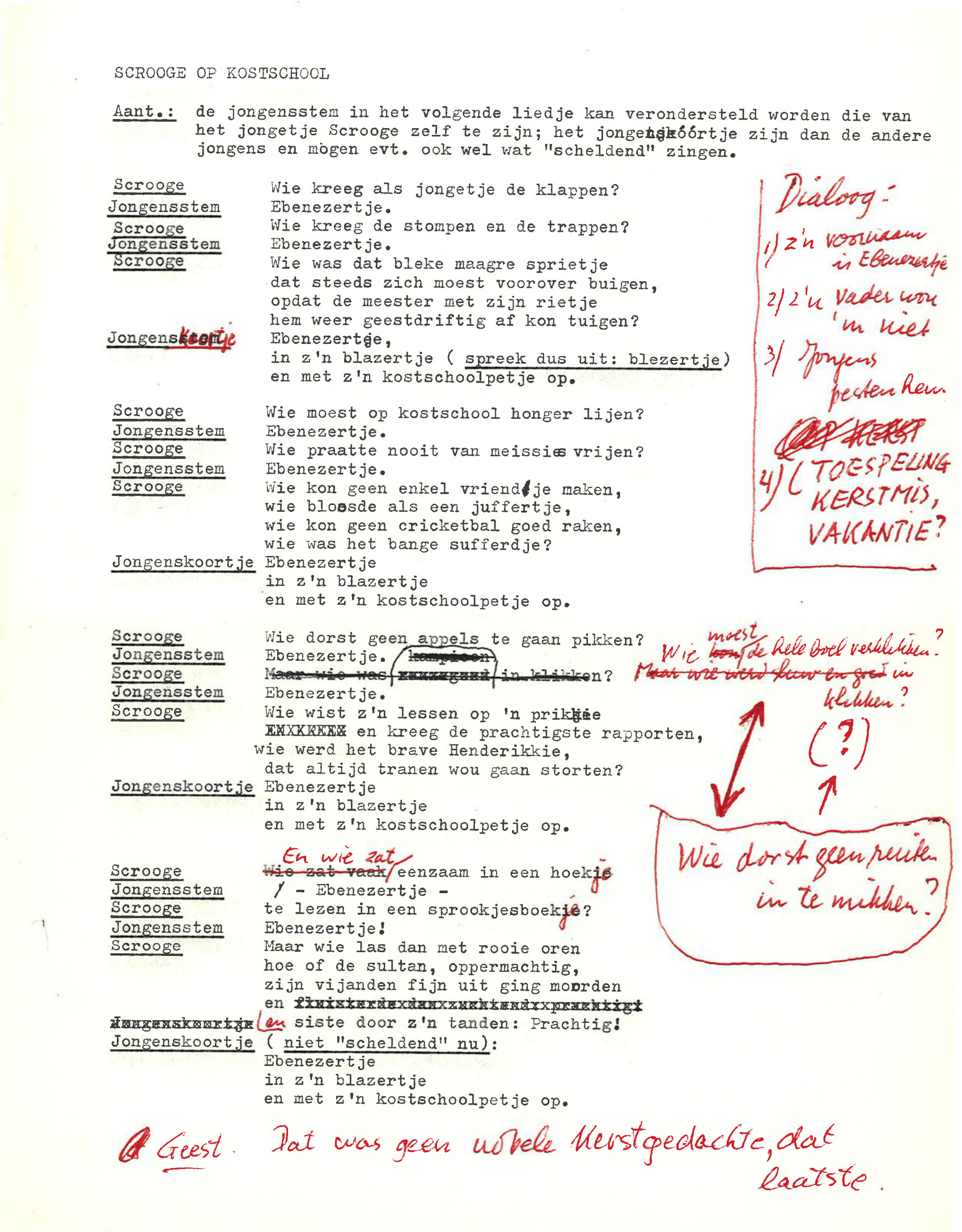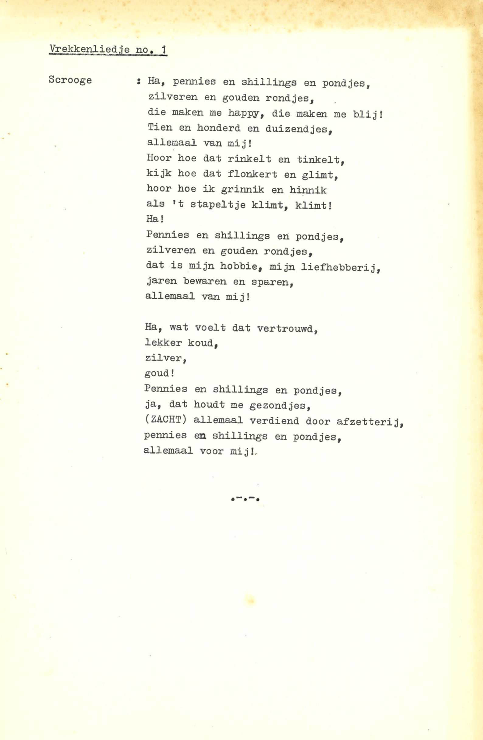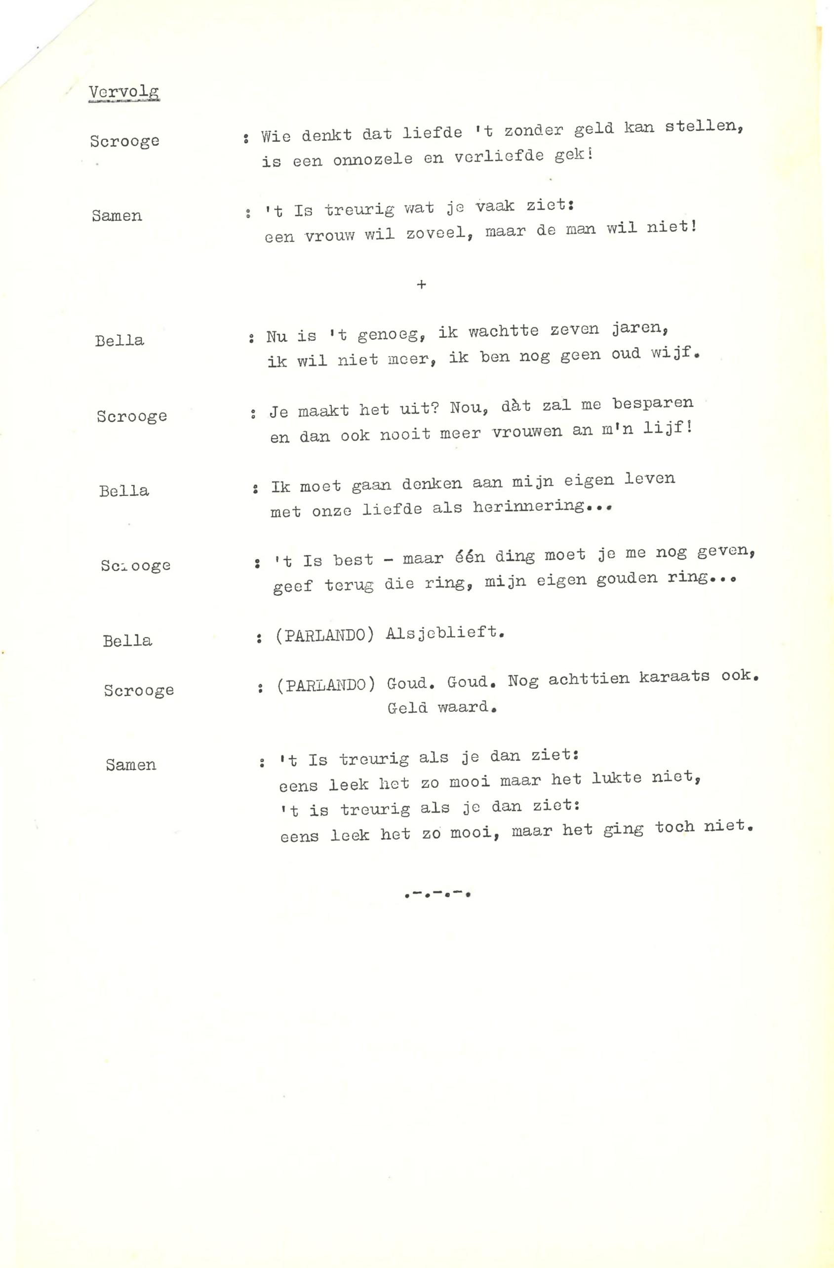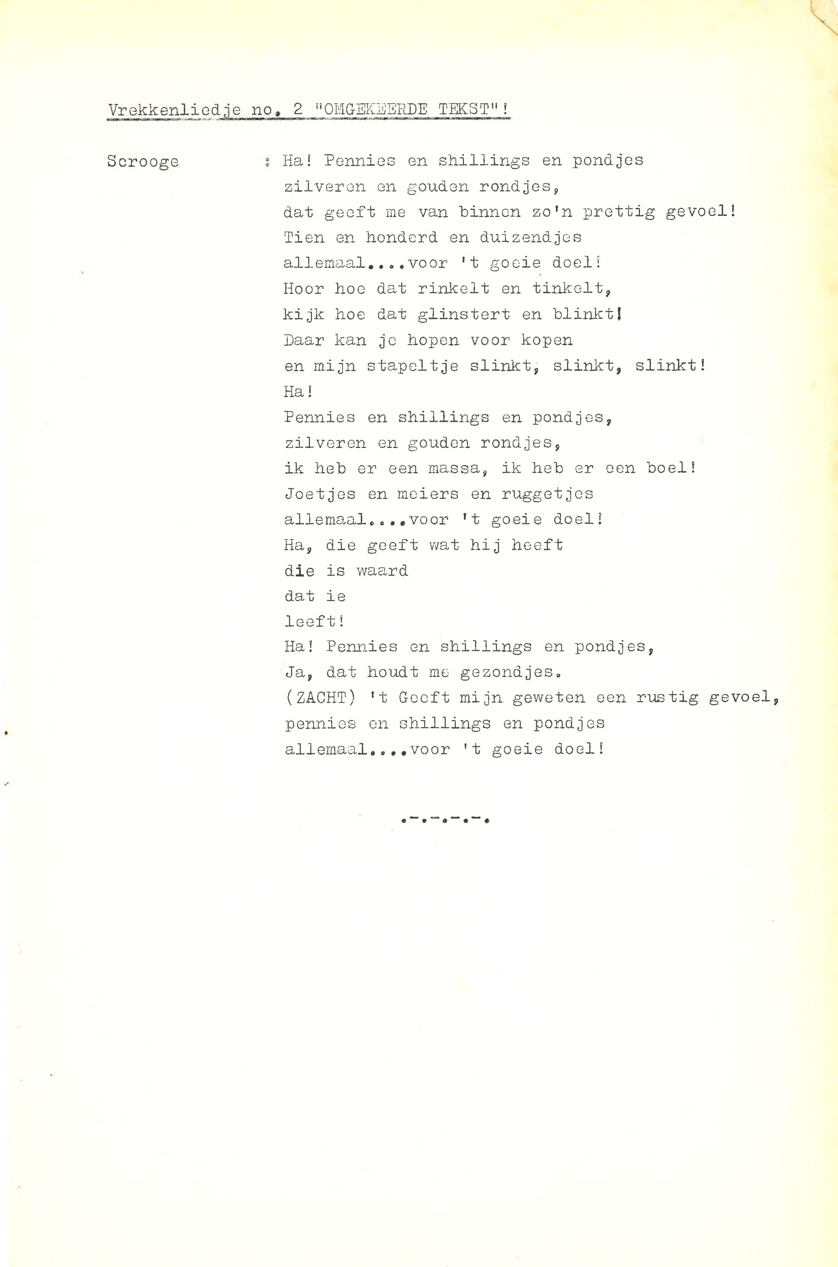 zingt Ebenezer Scrooge in de musical Scrooge en Marley, die op 23 december 1969 werd uitgezonden door de AVRO. De musical is geschreven door Hans Andreus, dichter en schrijver van romans, verhalen, hoorspelen en kinderboeken. Het is een vrije bewerking van Charles Dickens’ A Christmas Carol. In een dossier in het Literatuurmuseum tref ik de liedteksten en het typoscript van de musical aan. Verder zitten er dialogen, liedjes, poppenspellen en toneelteksten in de map, maar ik concentreer me omdat de feestdagen naderen op de kerstmusical.