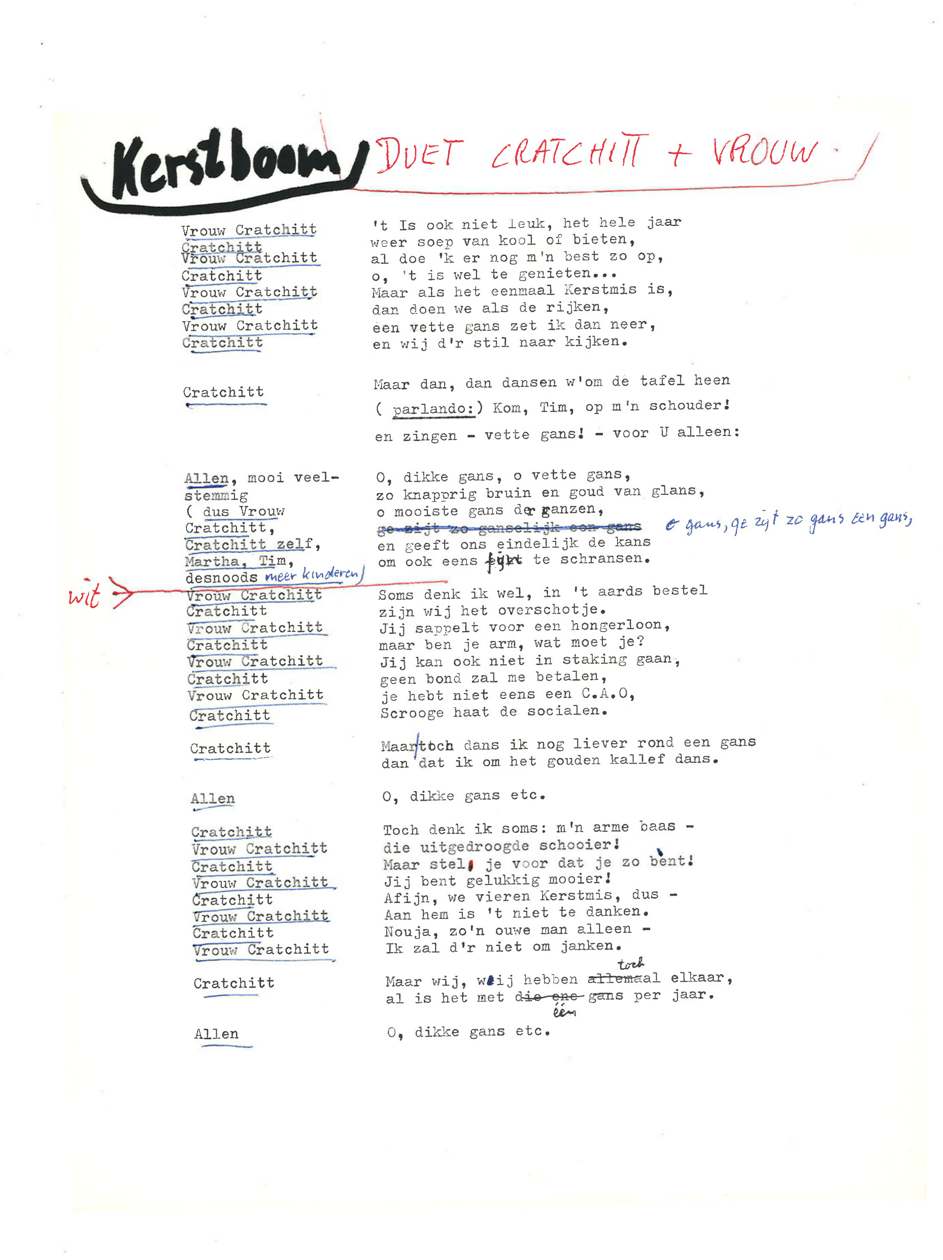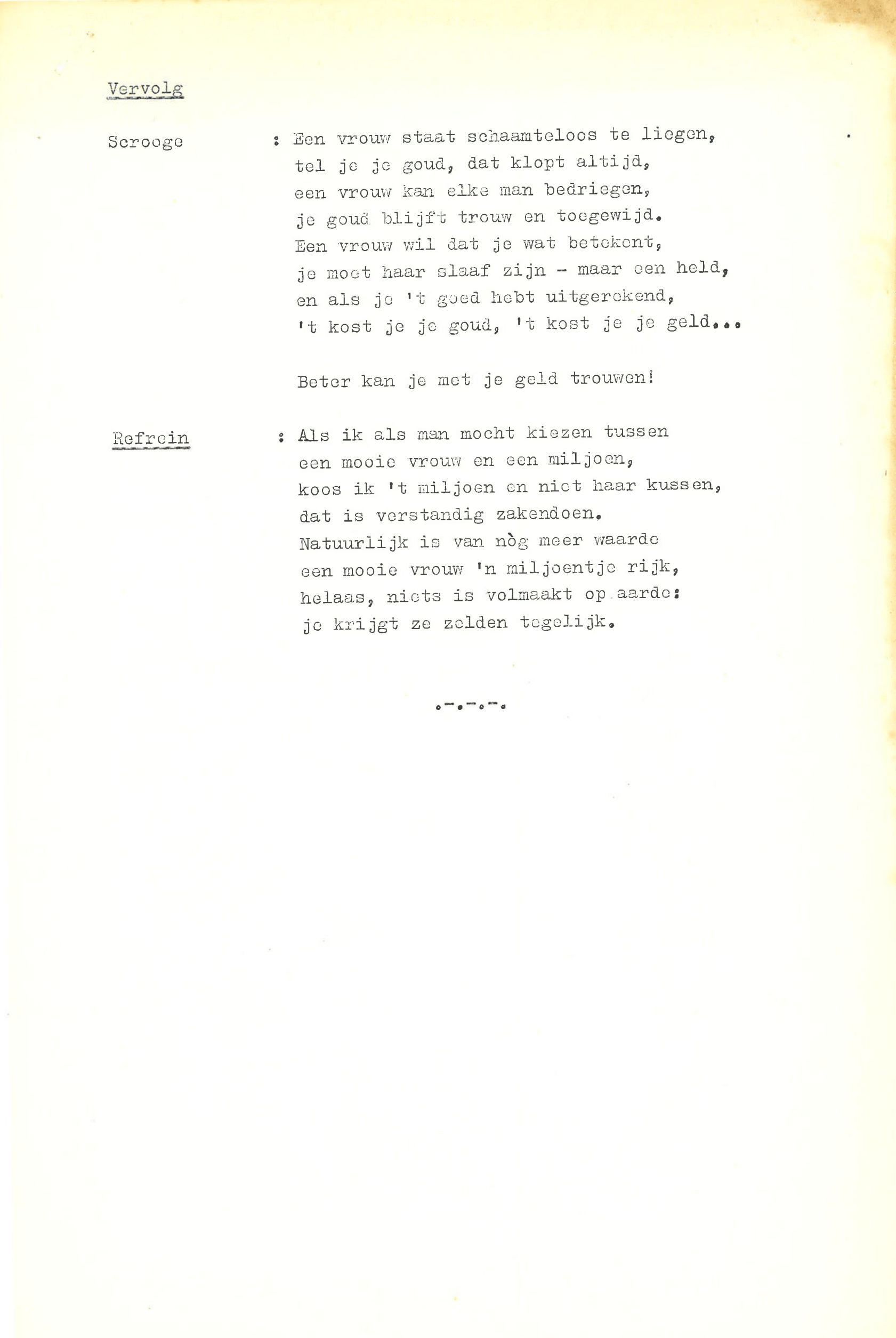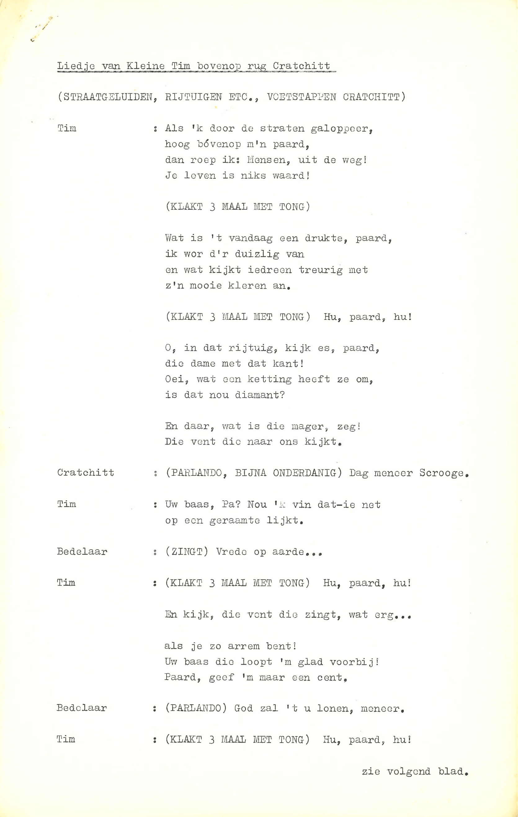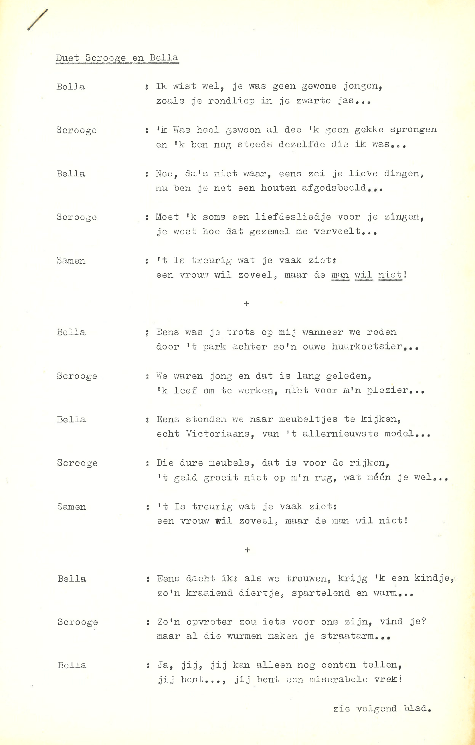 zingt Ebenezer Scrooge in de musical Scrooge en Marley, die op 23 december 1969 werd uitgezonden door de AVRO. De musical is geschreven door Hans Andreus, dichter en schrijver van romans, verhalen, hoorspelen en kinderboeken. Het is een vrije bewerking van Charles Dickens’ A Christmas Carol. In een dossier in het Literatuurmuseum tref ik de liedteksten en het typoscript van de musical aan. Verder zitten er dialogen, liedjes, poppenspellen en toneelteksten in de map, maar ik concentreer me omdat de feestdagen naderen op de kerstmusical.