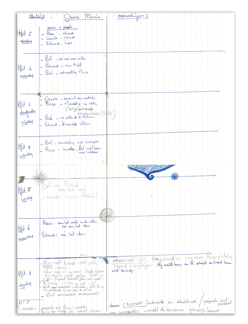 Over de opbouw van Rico’s vleugels is zorgvuldig nagedacht, blijkt uit Pepers aantekeningen: elk van de zes hoofdstukken beslaat een dag, op het derde hoofdstuk na, dat over de donderdag en de vrijdag gaat. Het verhaal begint op dinsdag, met als drie belangrijkste elementen ‘Rico strand’, ‘Cecile strand’ en ‘Eduard tuin’, aldus het handschrift van Peper. Deze lijst is vooral een overzicht van de locaties van de personages.