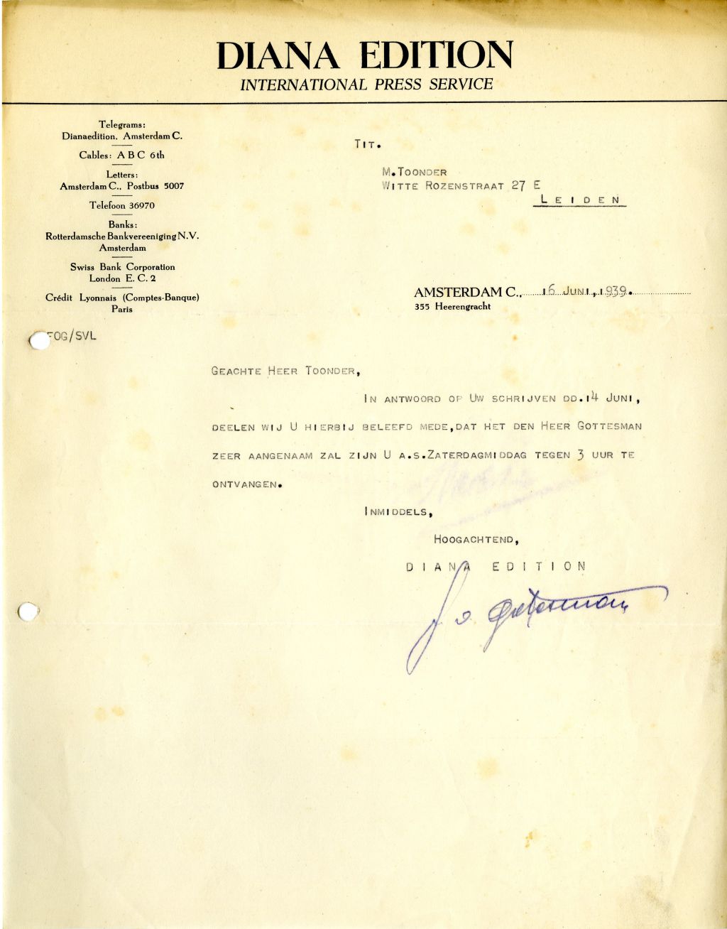 Aan het begin van de zomer van 1939 had Toonder kennisgemaakt met Fritz Gottesmann (1899-1945), een joodse Oostenrijker die zich in oktober 1938, een half jaar na de Anschluss, in Amsterdam had gevestigd. In Wenen runde hij een persagentschap, Diana Verlag, dat hij in zijn nieuwe woonplaats onder de naam Diana Edition, International Press Service, met vallen en opstaan voortzette. Zijn voornaamste werkzaamheden lagen op het terrein van het kopen en verkopen van de rechten van strips van en aan het buitenland.